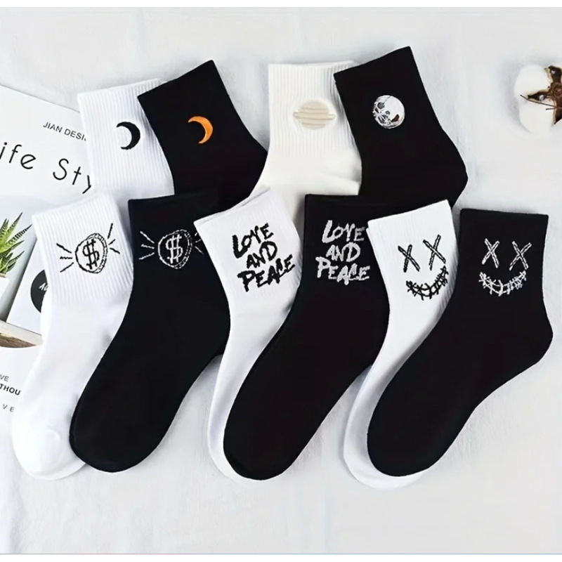 刺繍月星靴下男女中筒綿ins潮牌春秋街頭白黒アルファベット学生運動
