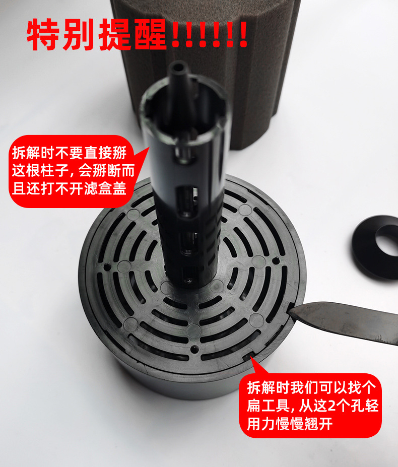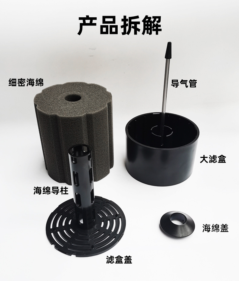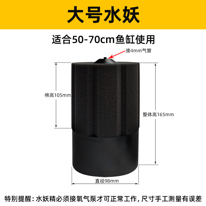 特别提醒:水妖精必须接气泵才能正常工作;水妖精使用时下滤盒要装满重的滤材或者沙石(另备),然后整个水妖精泡在水里挤压掉海绵里的空气让其充分吸水,这样才会沉底!