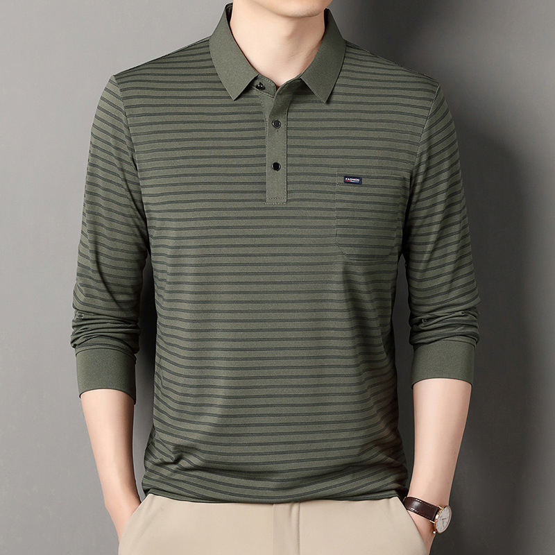 メンズ長袖ポロシャツトップス薄手中高年お父さん秋服ポケット付きTシャツラペルストライプボトリングシャツ男性用