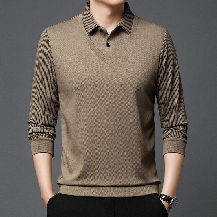 メンズポロシャツ長袖春秋新作ハイエンドビジネスカジュアルメンズ偽2枚襟付きストライプtシャツ上着