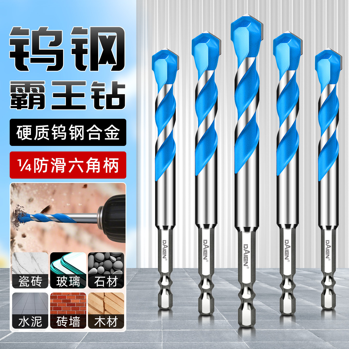 多機能覇王ドリル六角柄ドリルタイルガラス石材赤レンガ穴開けドリル5点セット覇王ドリル