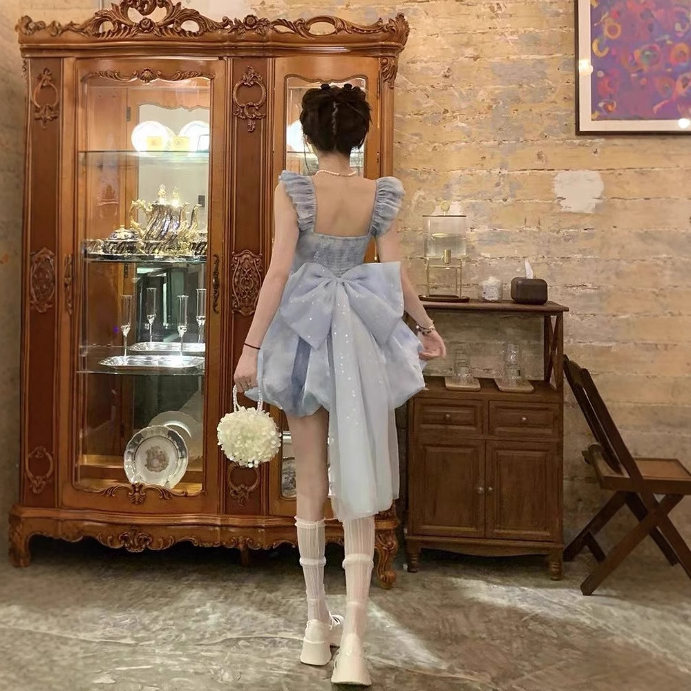 フランスの甘い青い蝶結びのストラップワンピース女性の夏の高級感の気質の王女の蓬蓬のスカートのつぼみのスカート