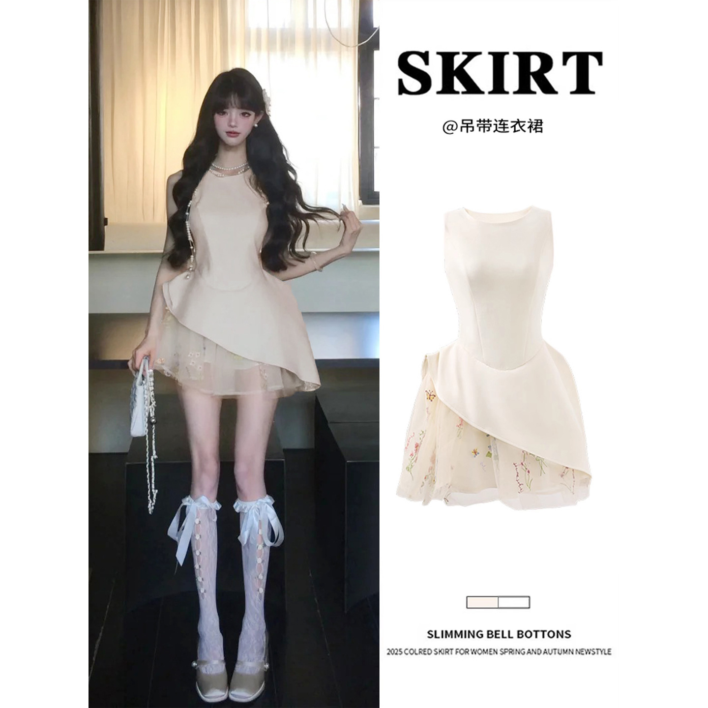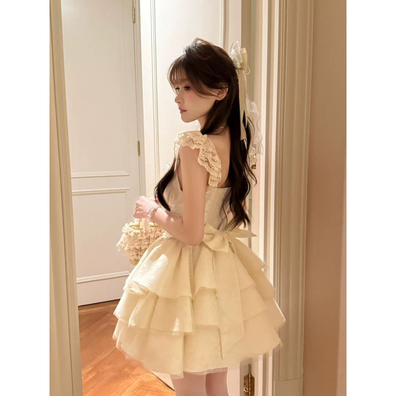アプリコットノースリーブドレスプリンセススタイルふわふわスカート裾ステッチメッシュベストドレス2025夏服