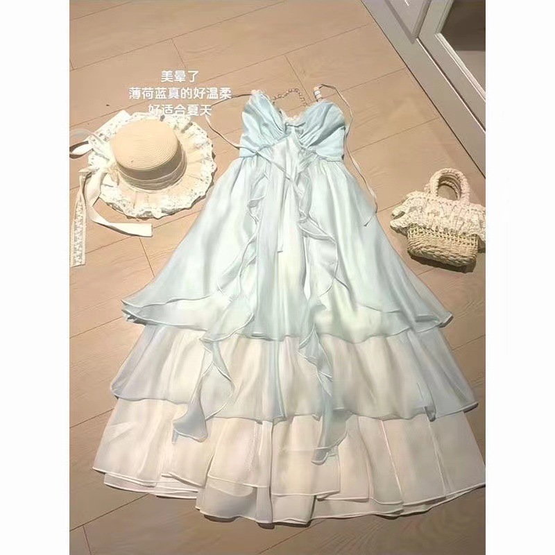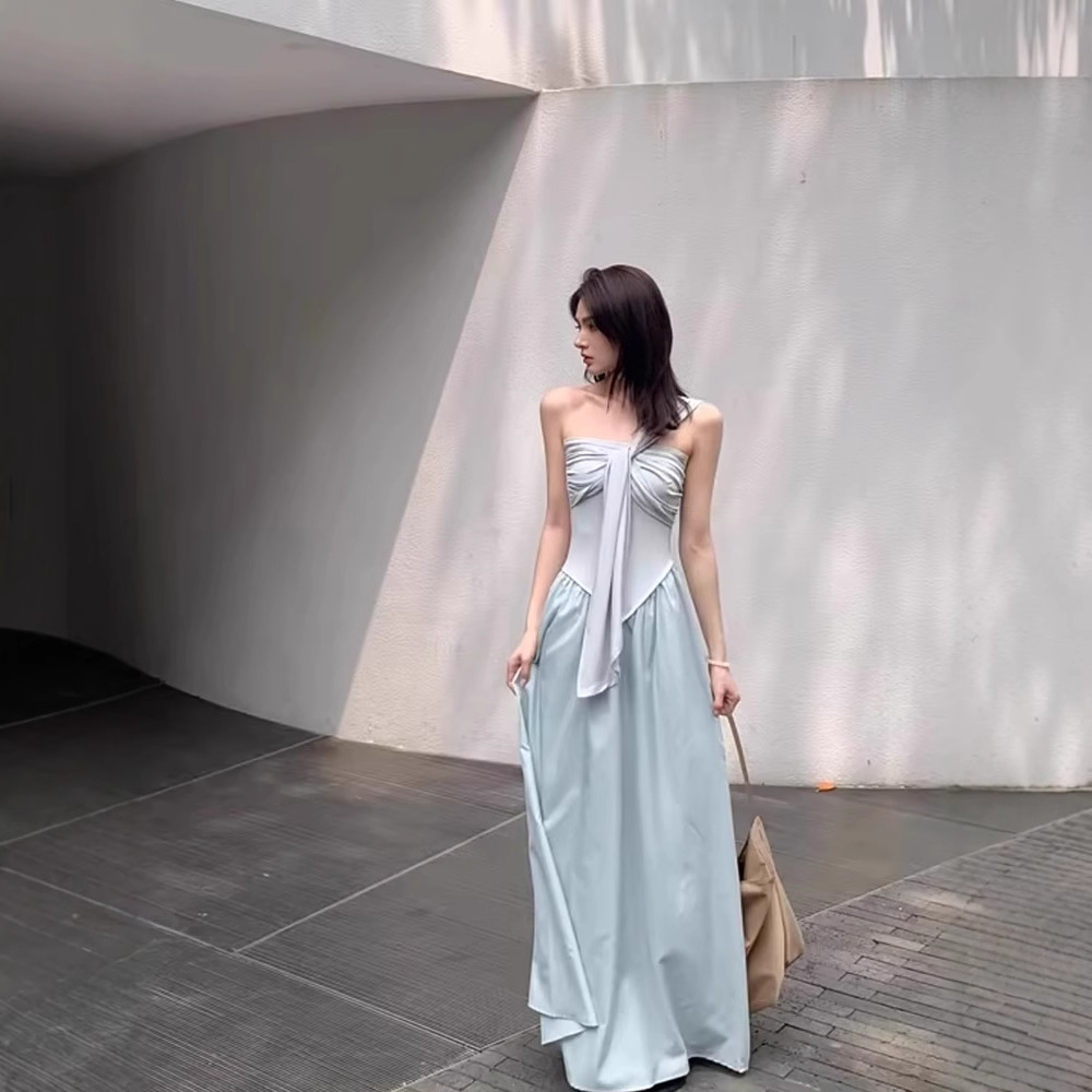 蓝色海边度假抹胸连衣裙子女夏季新款冷淡系独特别致气质长裙
