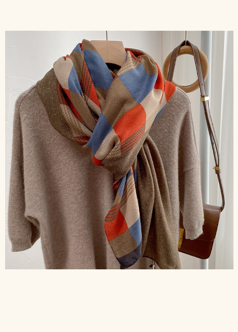 暖かい色の格子の綿麻のマフラーをつなぎ合わせます。