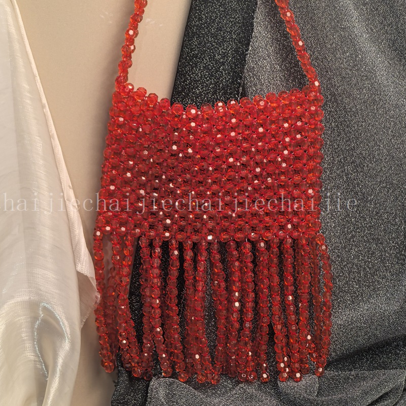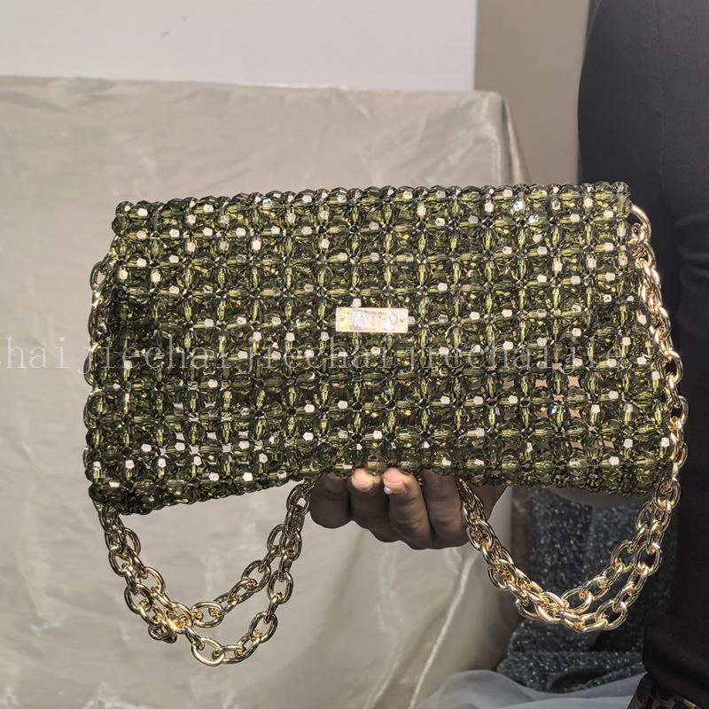 新しい女性バッグDIY手作り編みバッグアクリルビーズハンドバッググリーンフリンジシングル肩脇下バッグ