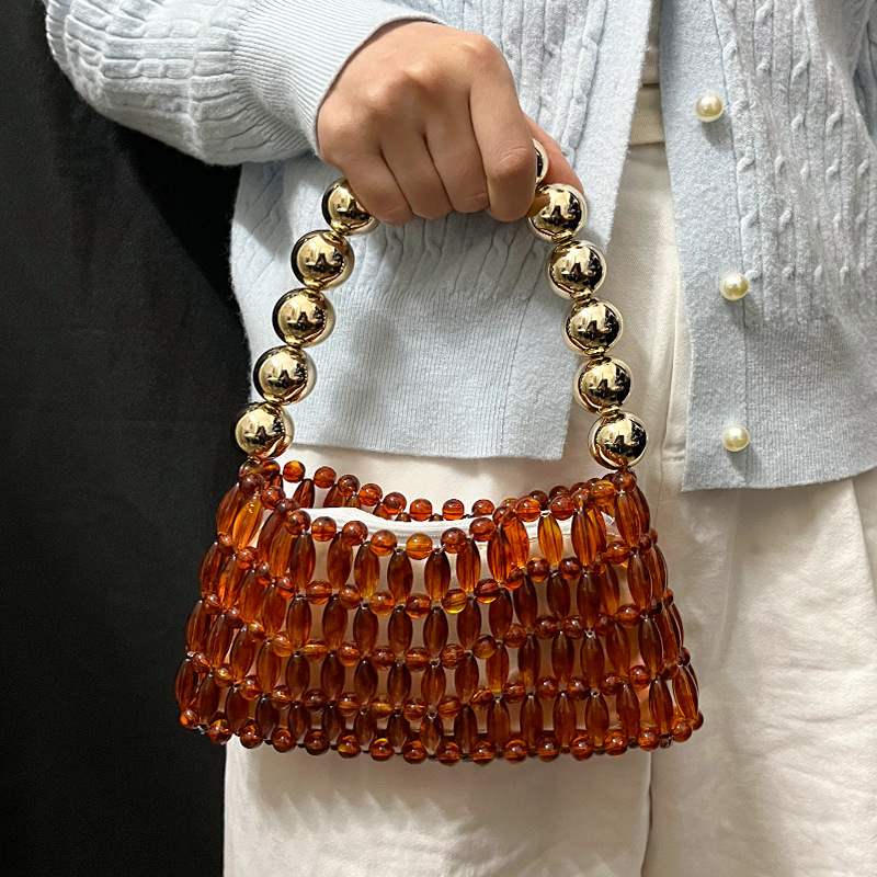 气质水晶琥珀棕款小众轻奢手工串珠手提包镂空复古玳瑁色高级晚宴