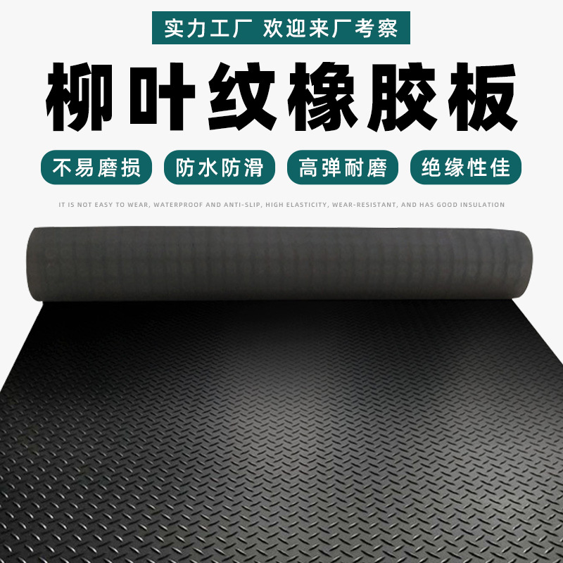 黒の滑り止めゴムシート、柳の葉模様の床材、絶縁性、耐摩耗性、衝撃吸収ゴムマット、5本のバーの丸バックル柳の葉ゴムシート