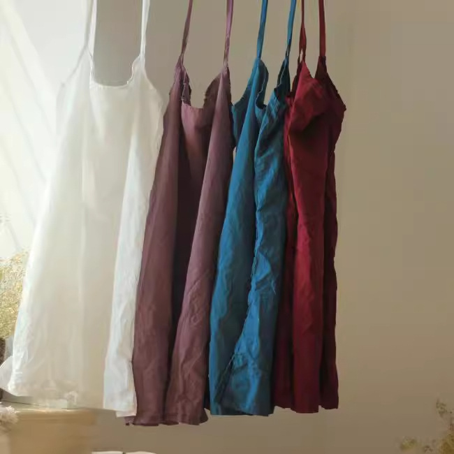 新しい夏の純綿のキャミソールの婦人服の綿と麻の純色は底を打って外に文芸の復古の薄い金のゆったりしている上着を着ます。