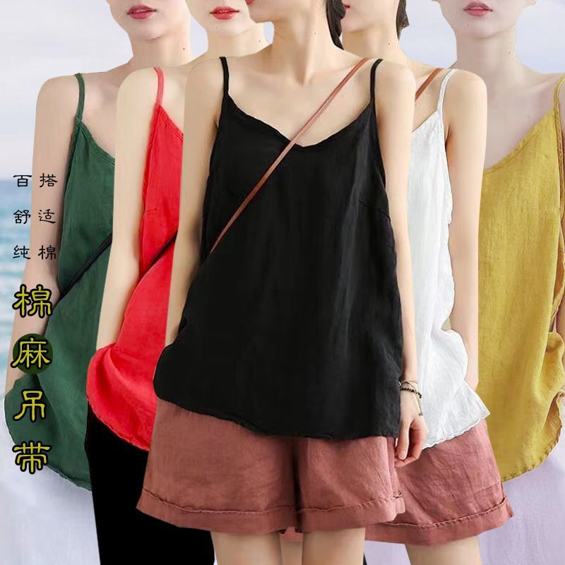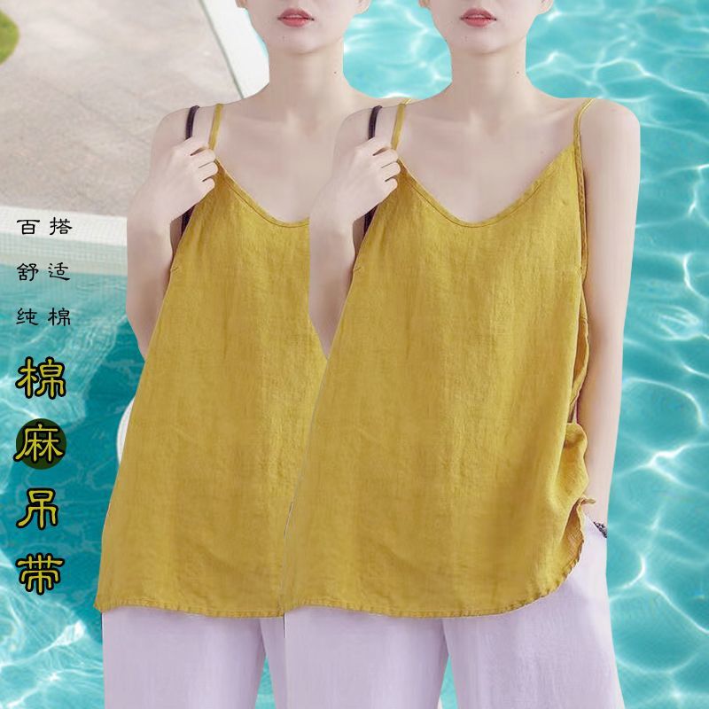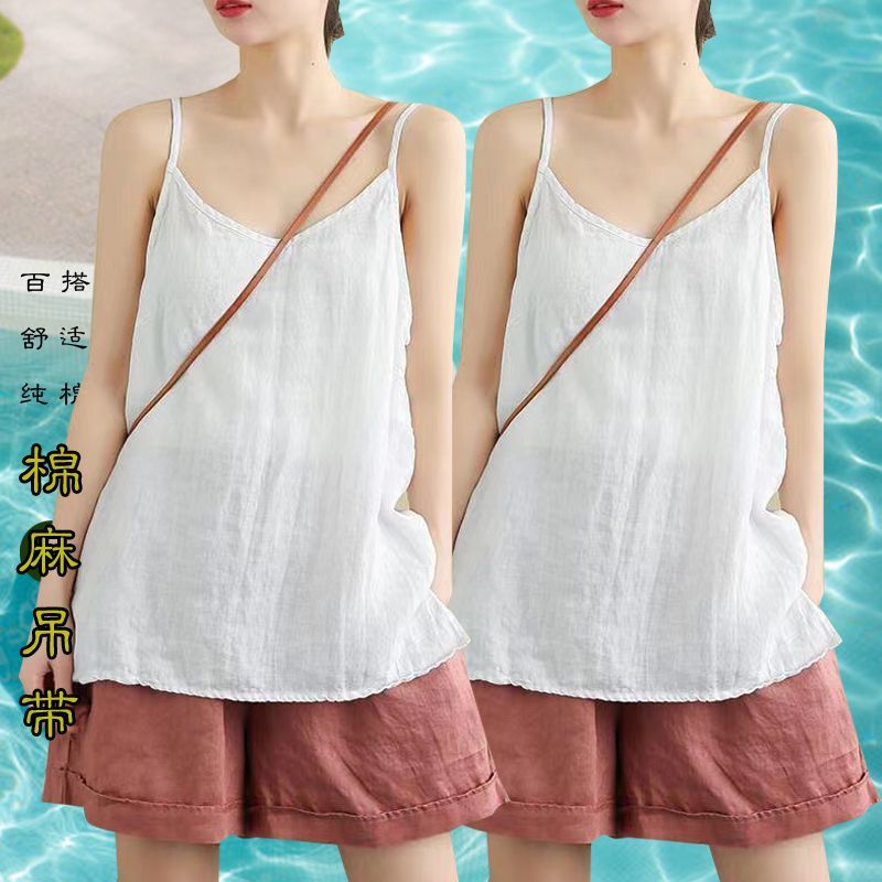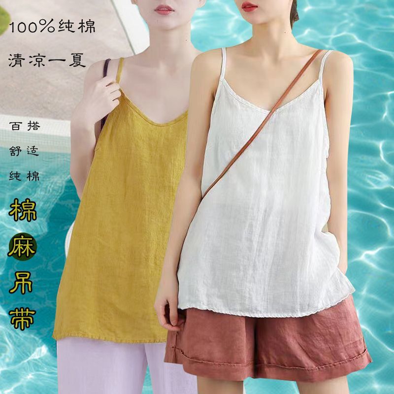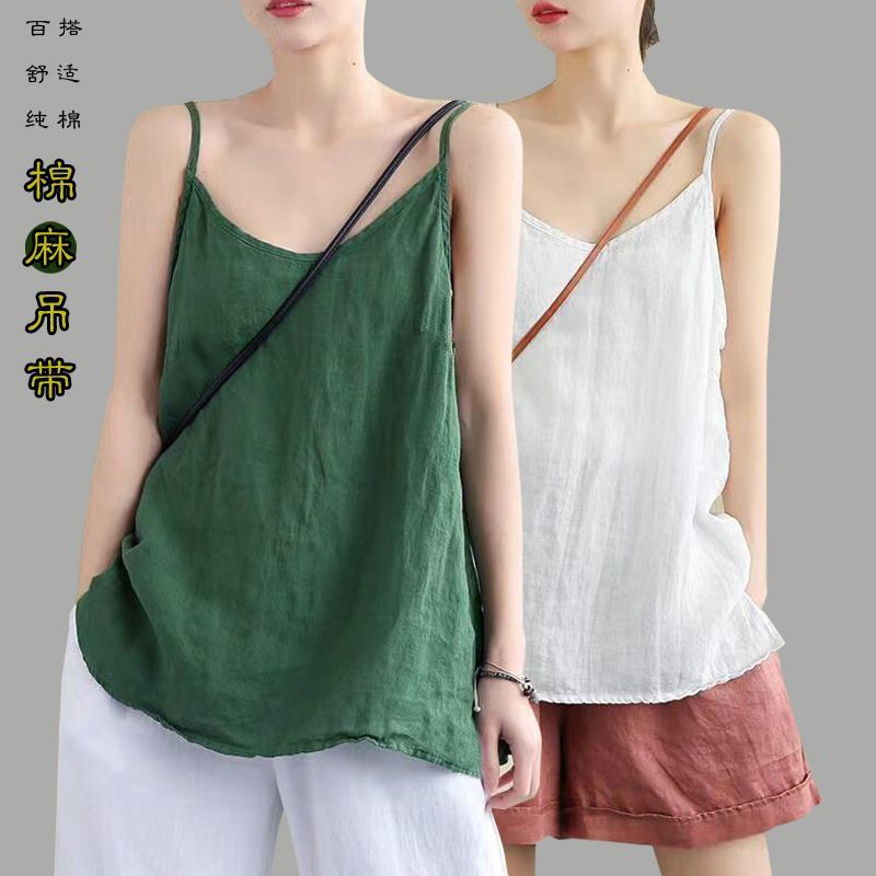 綿と麻の小さなサスペンダーレディースルーズで軽いインナーVネック綿と麻のベストノースリーブトップ夏の新しい文学トレンド