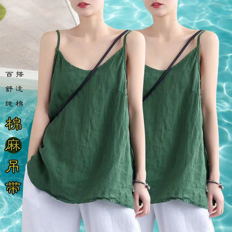 2025 ヨーロッパとアメリカの綿とリネンのキャミソール女性の夏の新しいルーズコットンとリネンのインナーノースリーブ多用途ボトムトップ