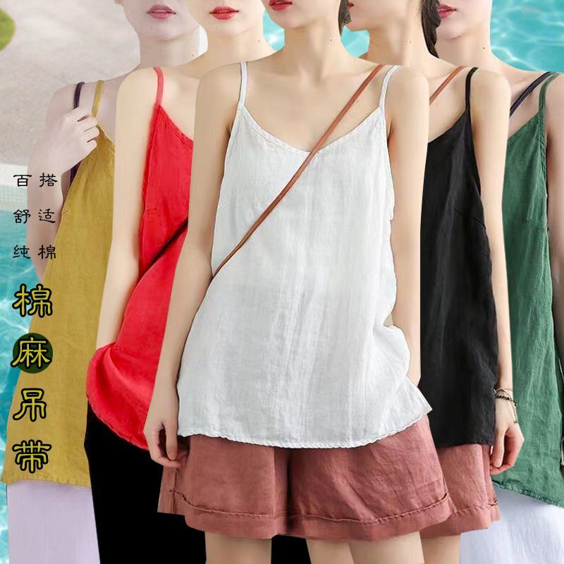 夏の新しいスタイルのアートコットンとリネンのキャミソールレディースルーズインナー無地シンプルノースリーブボトムス大きいサイズトップ