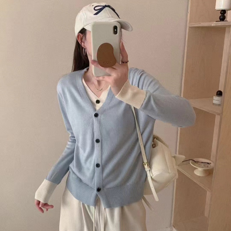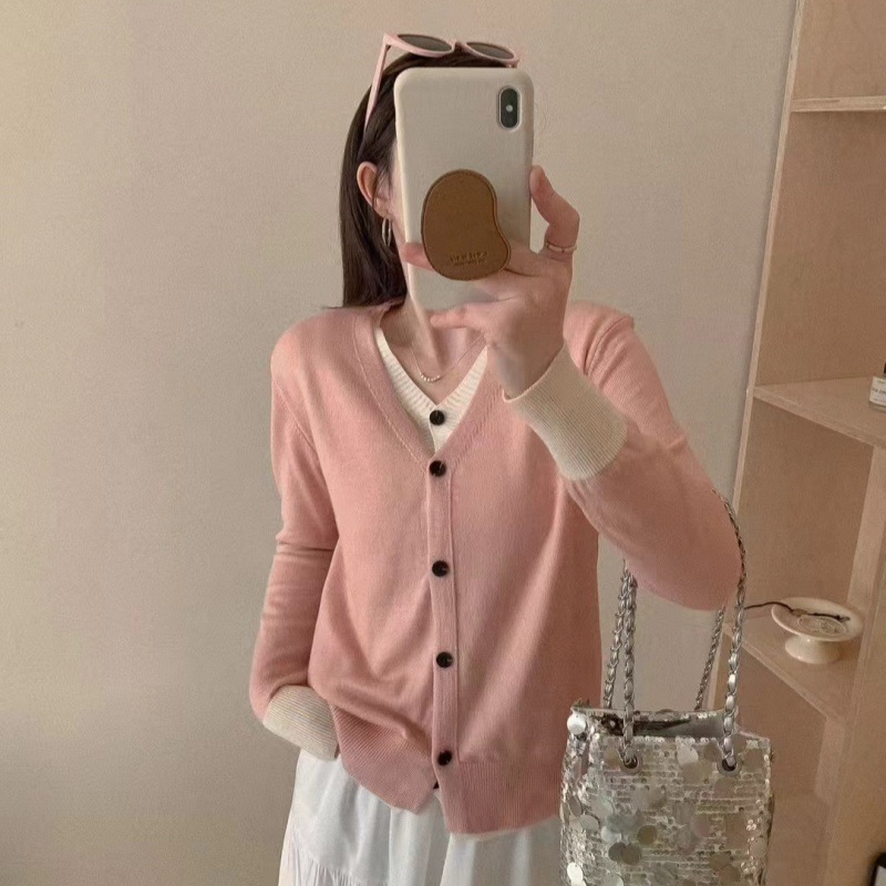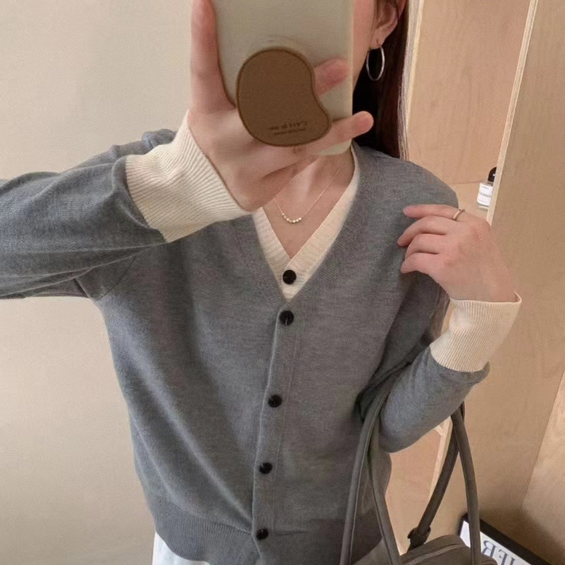 偽の2つの色合わせのウールのニットのカーディガンの女性ヨーロッパ駅2025春秋服の新型のヨーロッパの商品の婦人服の底のシャツのファッション