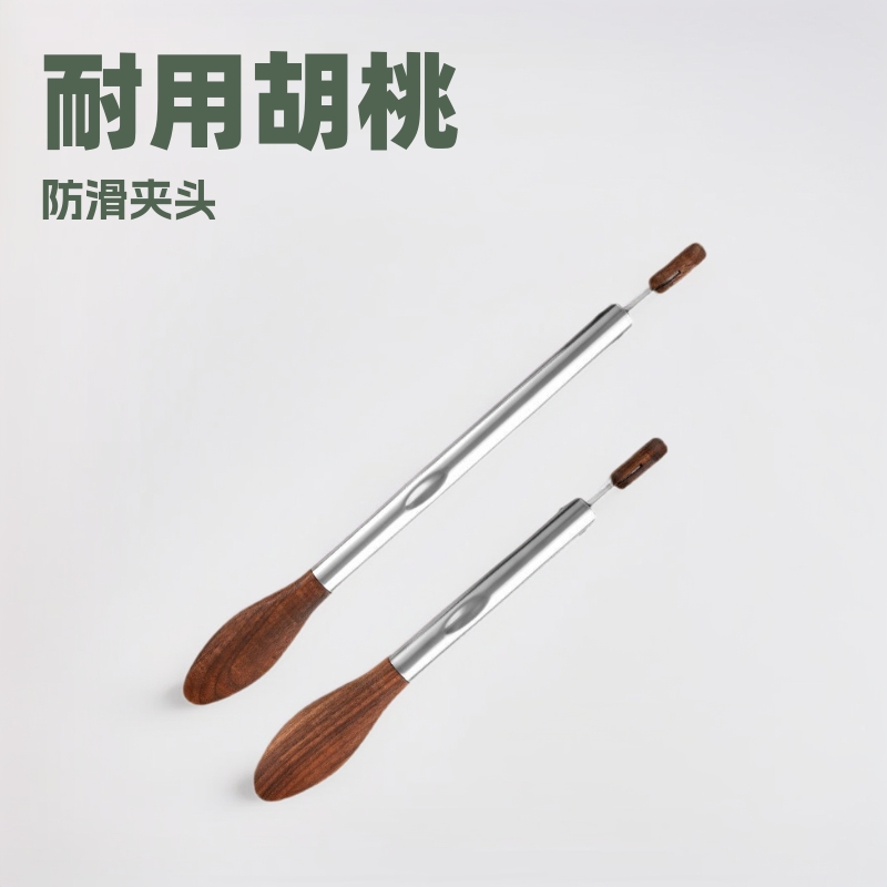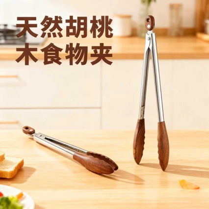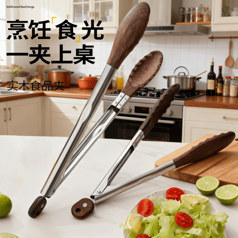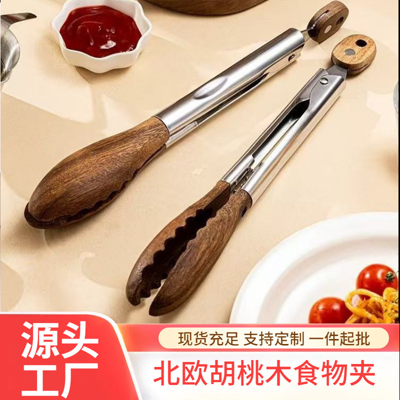胡桃木不锈钢食品夹厨房9寸12寸面包食物夹户外BBQ烤肉牛排烧烤夹