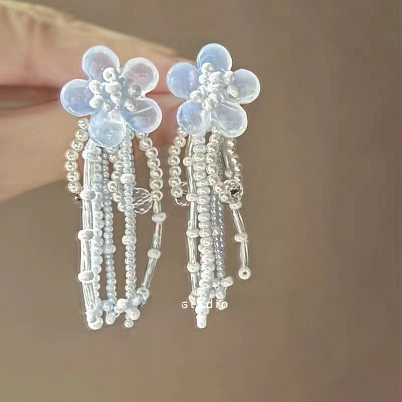 ドリームパフ〜雰囲気のあるスーパーフェアリーブルーの花びらタッセルイヤリング、女性用、ハイエンドイヤリング、ニッチロングイヤリング