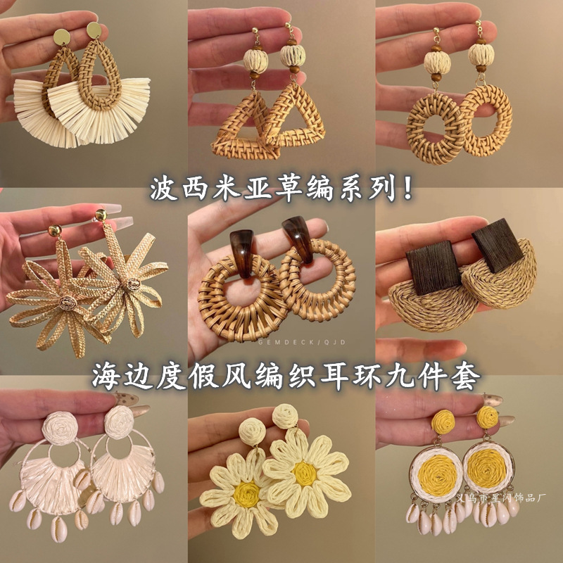 夏日海边度假风藤编扇形耳钉高级感夸张气质耳环波西米亚独特耳饰