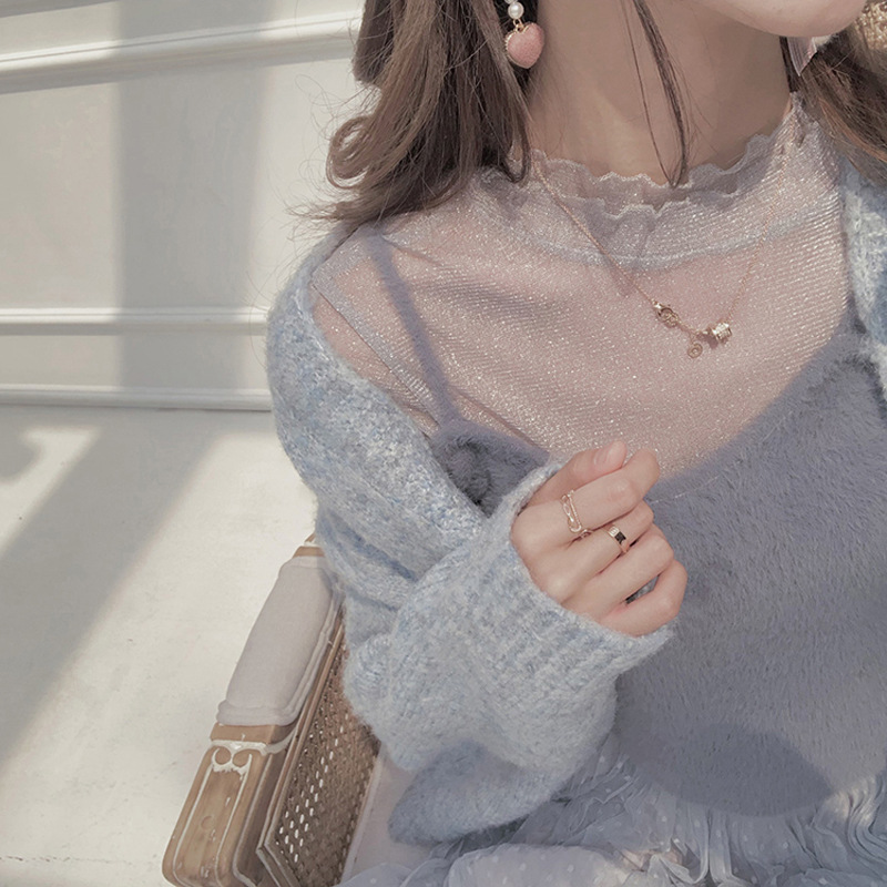 非常に仙人の上着の韓国版の百合亮の銀糸の長袖の中でレースのネットの紗の高い襟の底のシャツの女性の秋冬の新型