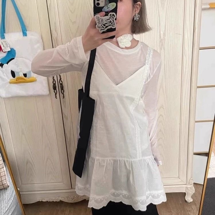 小柄な女性向けレースサスペンダードレスレイヤードスーツ、初春白ペチコート、ハイネックボトムTシャツ2点セット