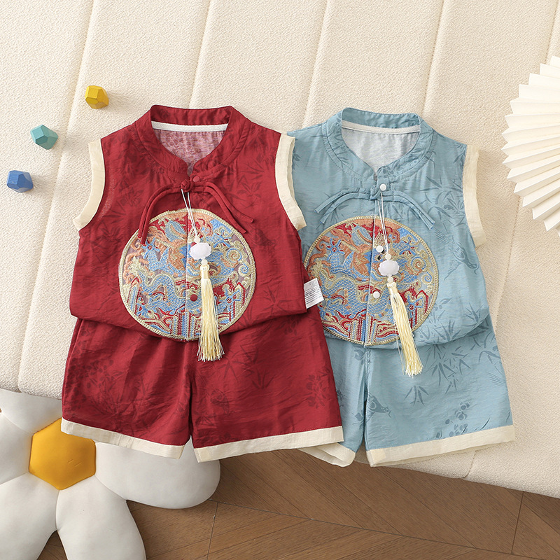 夏の新しい中国風の薄いシングルブレスト新生児中国風スタンドカラーパッチワークレッドスーツ