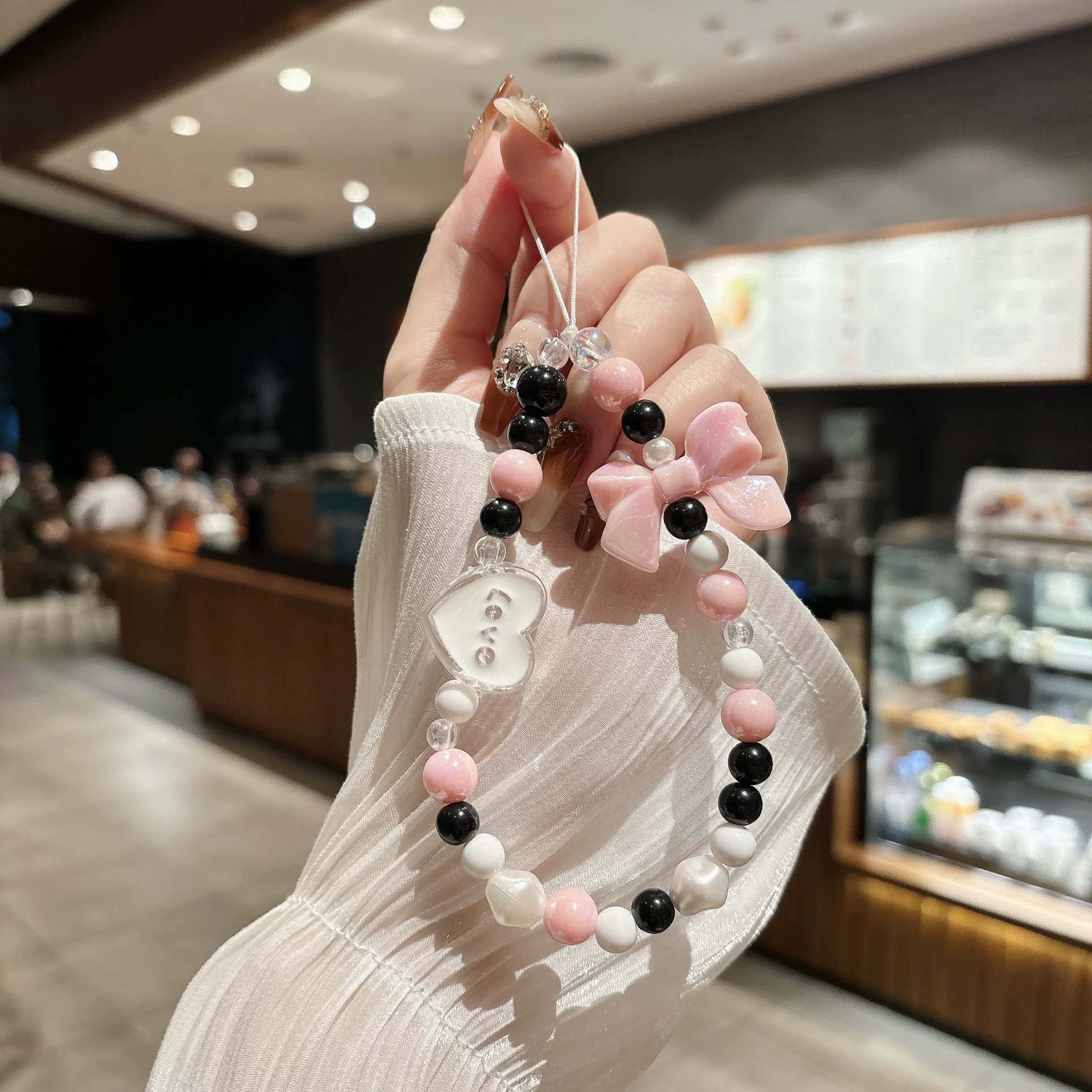 韩风少女粉蝴蝶结珠珠手链简约便携手绳挂绳手机壳手机挂链珠链