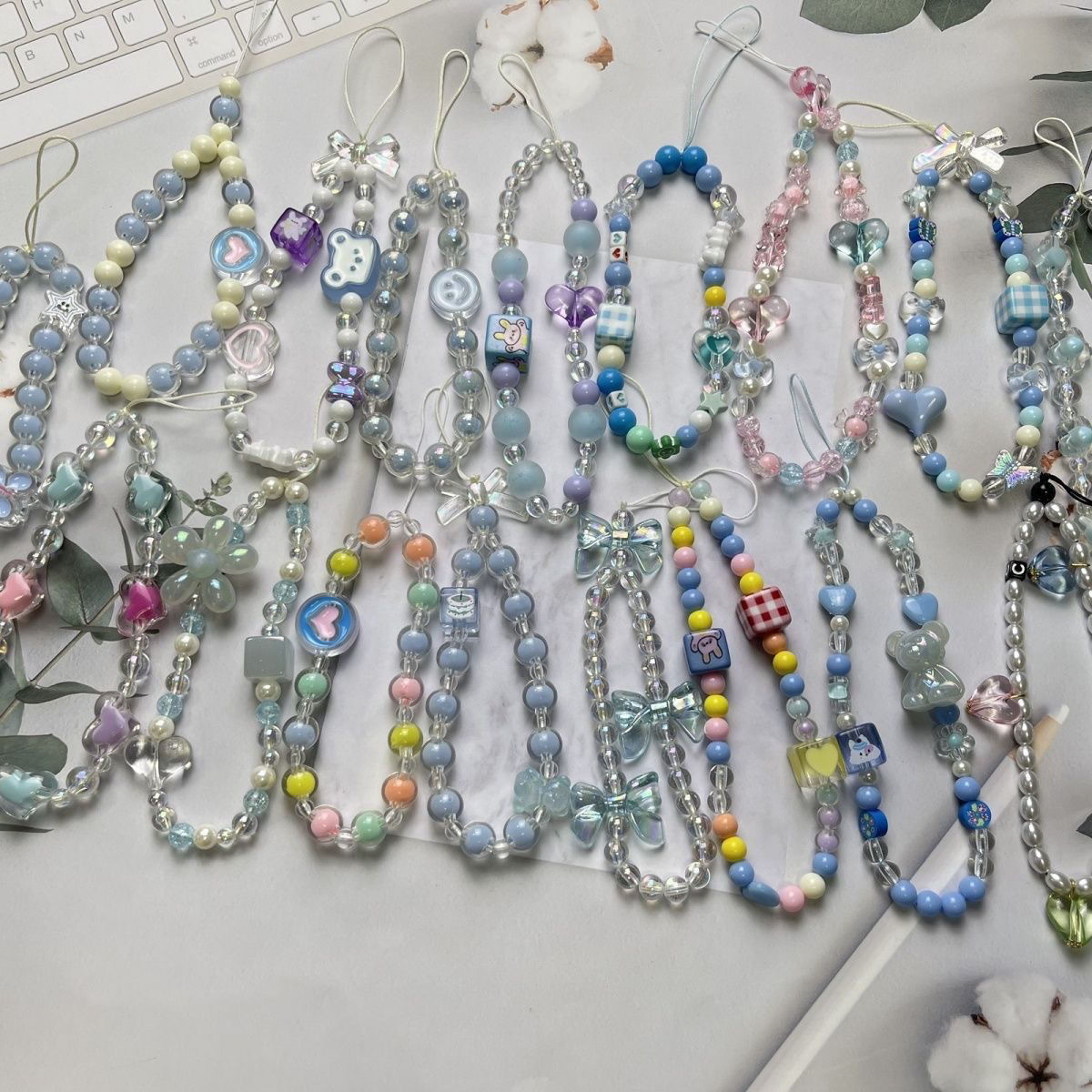 创新糖果镀彩蝴蝶结串珠手机链手机挂绳弹簧圈手机壳挂件DIY配饰