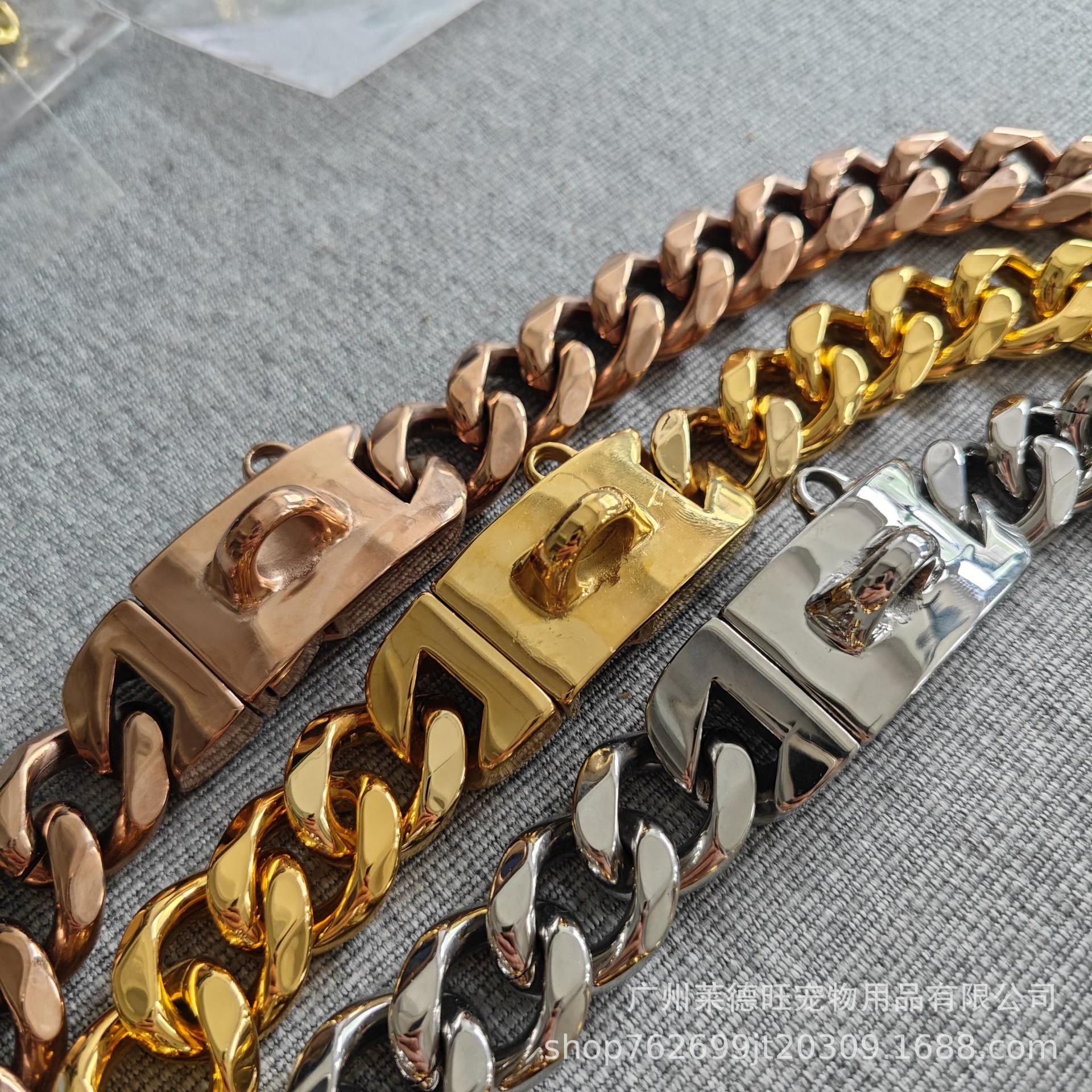 现货亚马逊新款19mm防咬不锈钢金色项圈钛钢狗链狗圈颈圈工厂直销