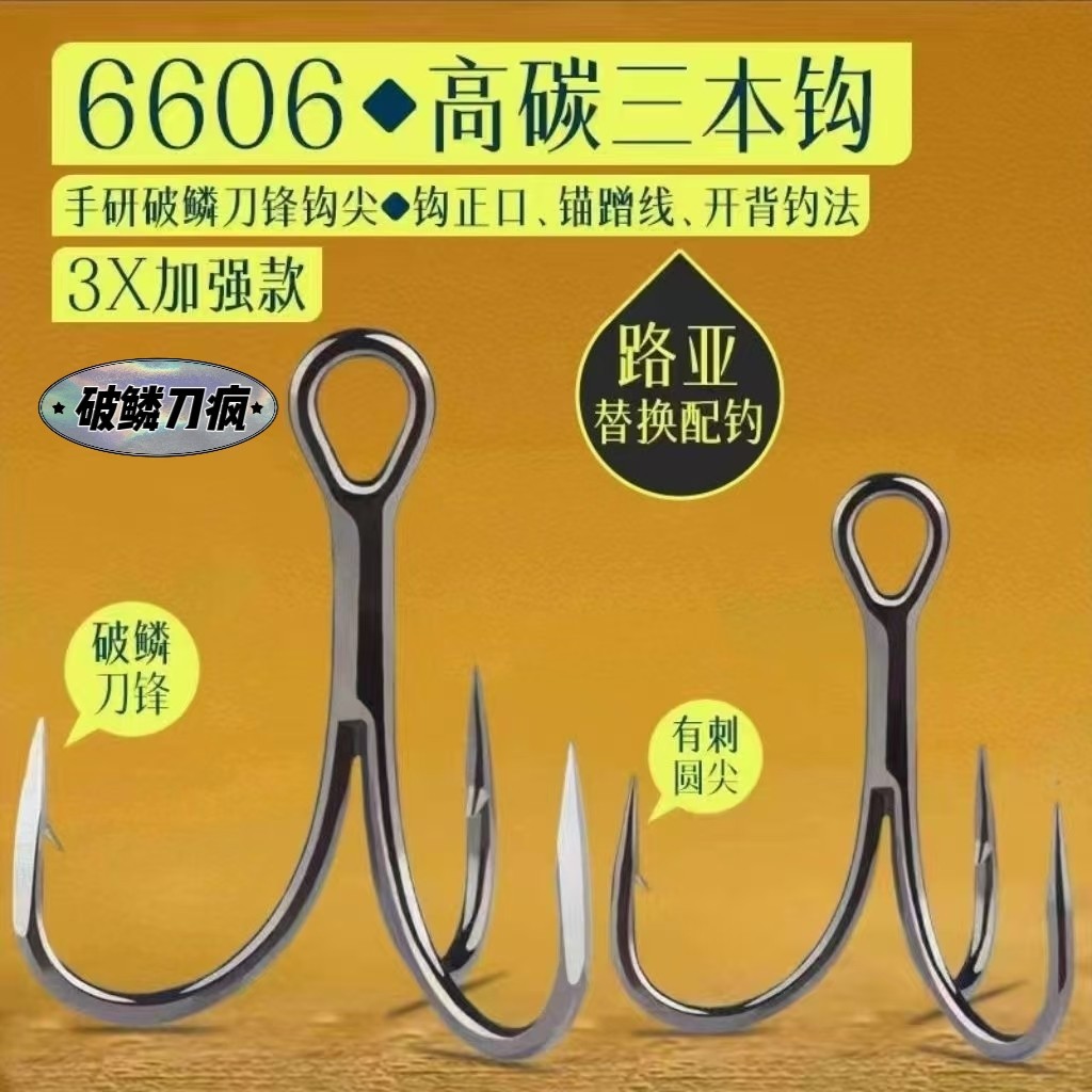破鱗刃3x強化6066路亜三本フック破鱗刃の三本フックには逆刺開背路亜フックがあります。