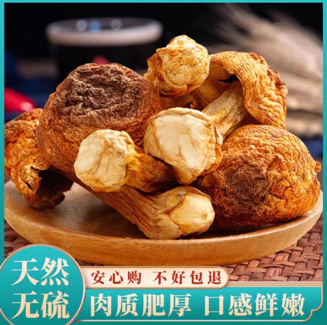 福建古田特産の姫松茸の新鮮な干物卸売り無薫硫黄肉厚菌茸スープ食材の肉質は脆くて柔らかいです。