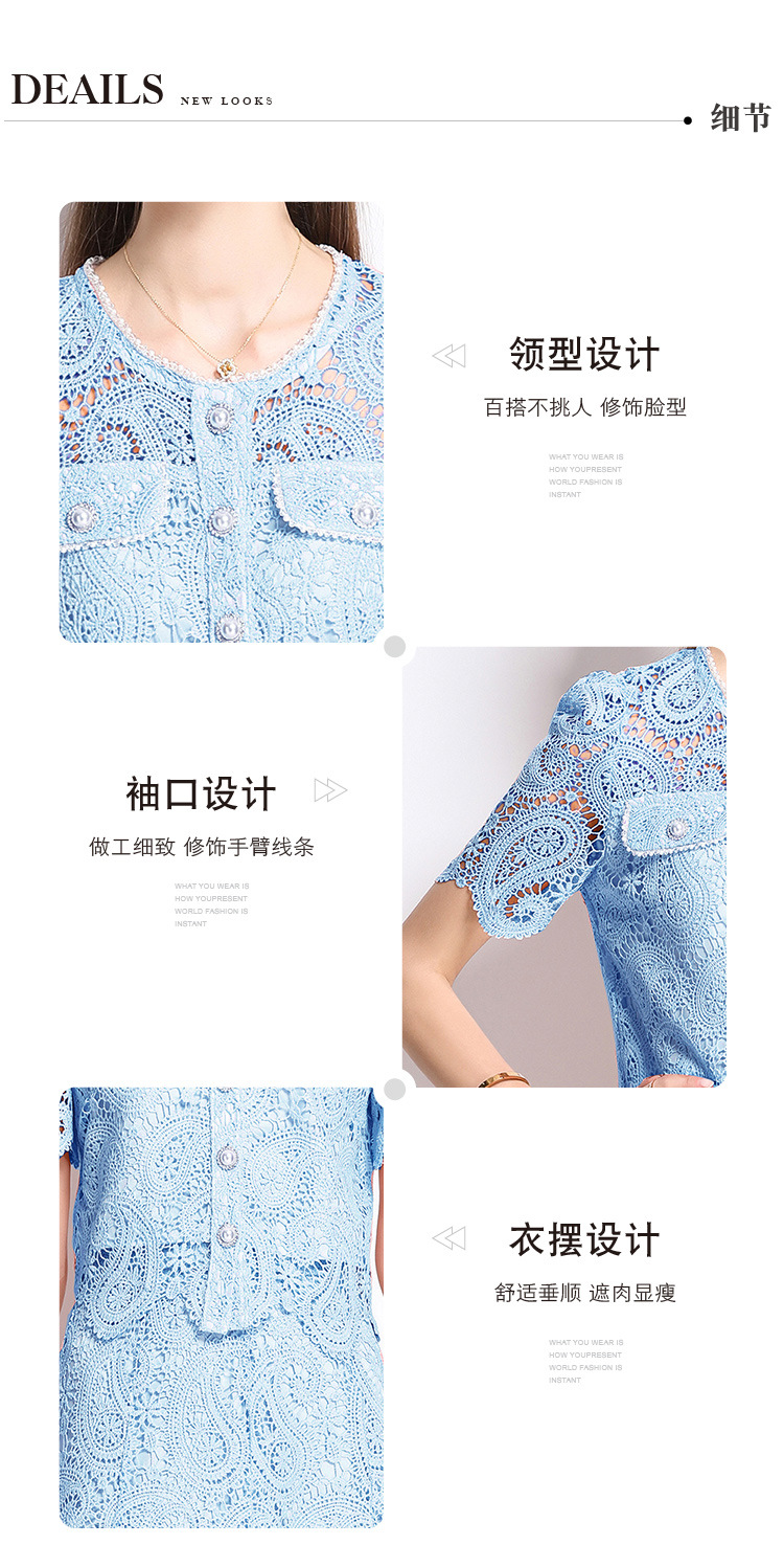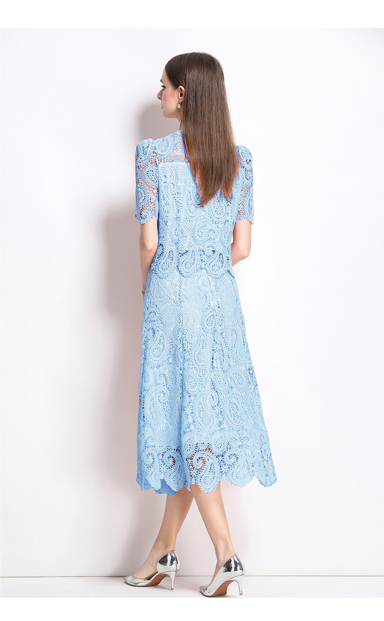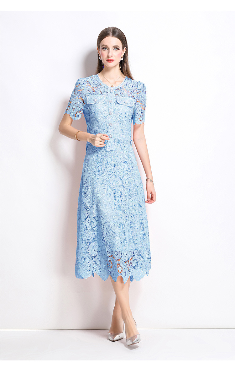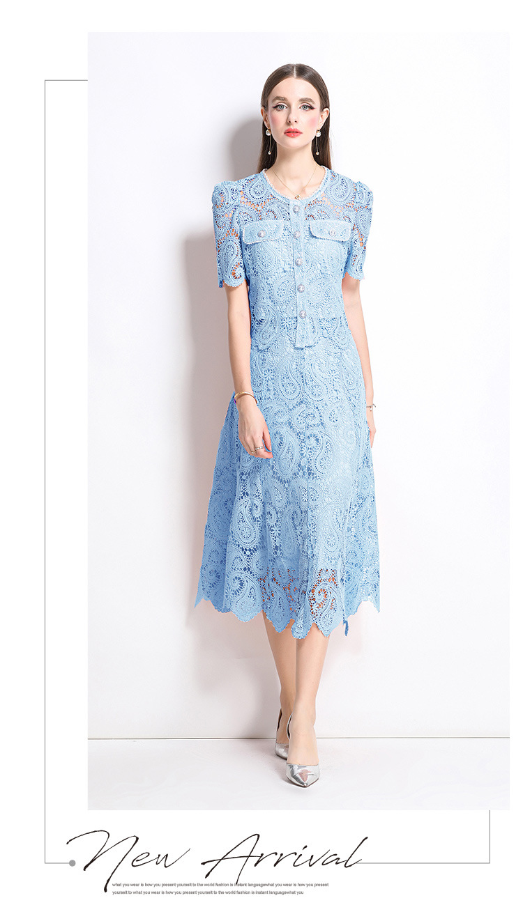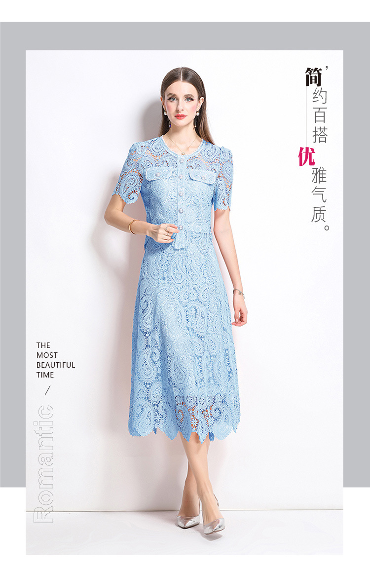 夏の新しい半袖レースドレスの女性のミッドレングスフックパターン中空紫ハイウエスト Aa ラインスカート痩身