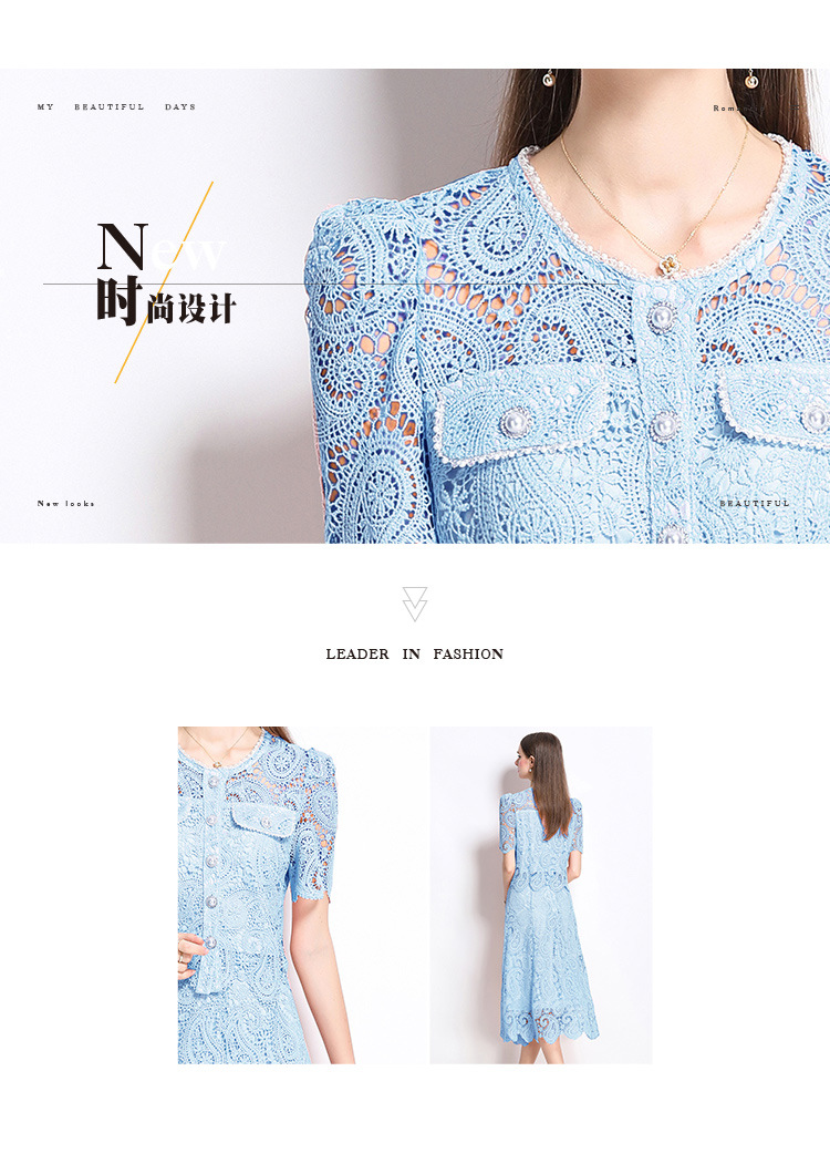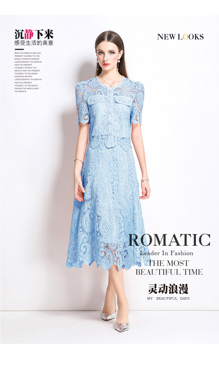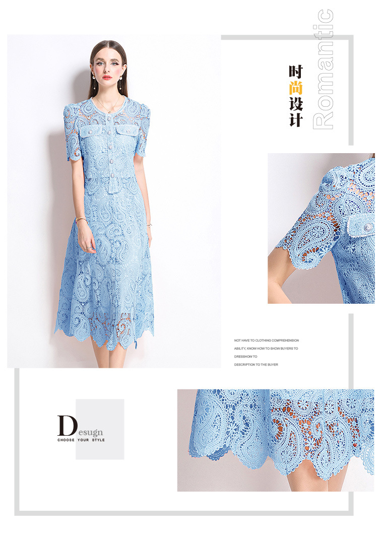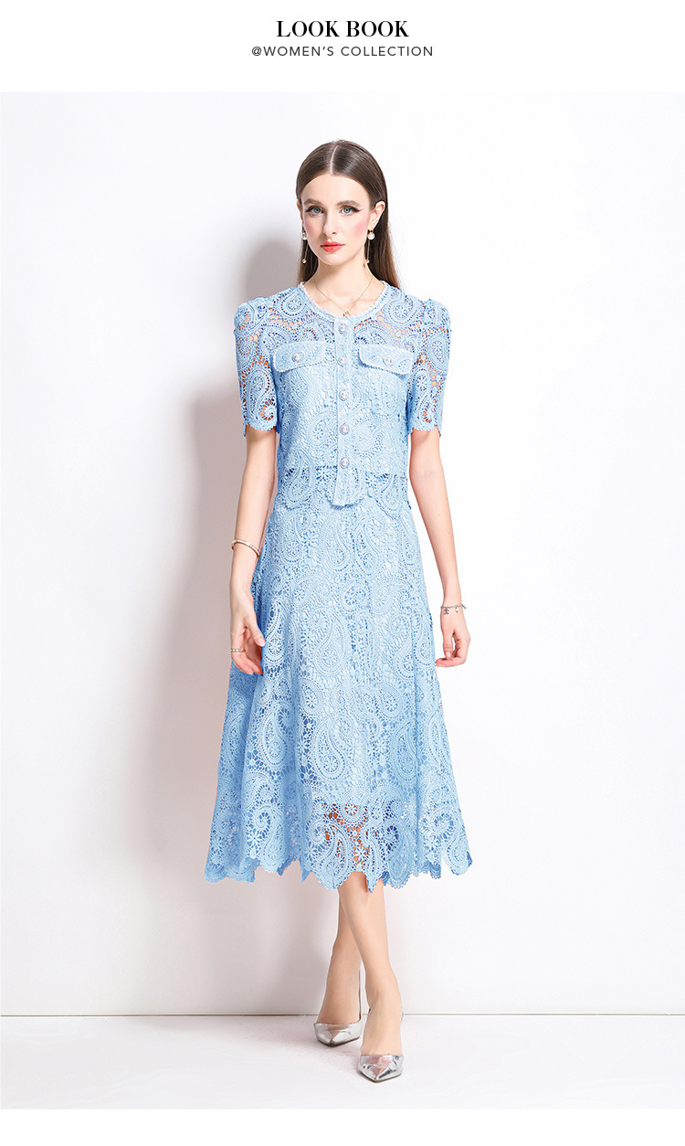 法式浪漫复古蕾丝钩花钻领上衣中长款鱼尾半身裙时尚套装