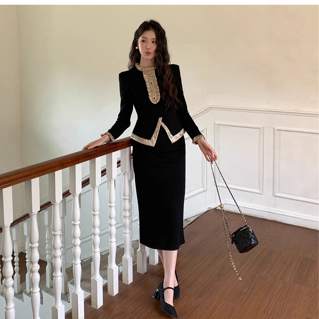 名媛风气质黑色时尚套装女新款收腰显瘦荷叶边上衣半身长裙两件套