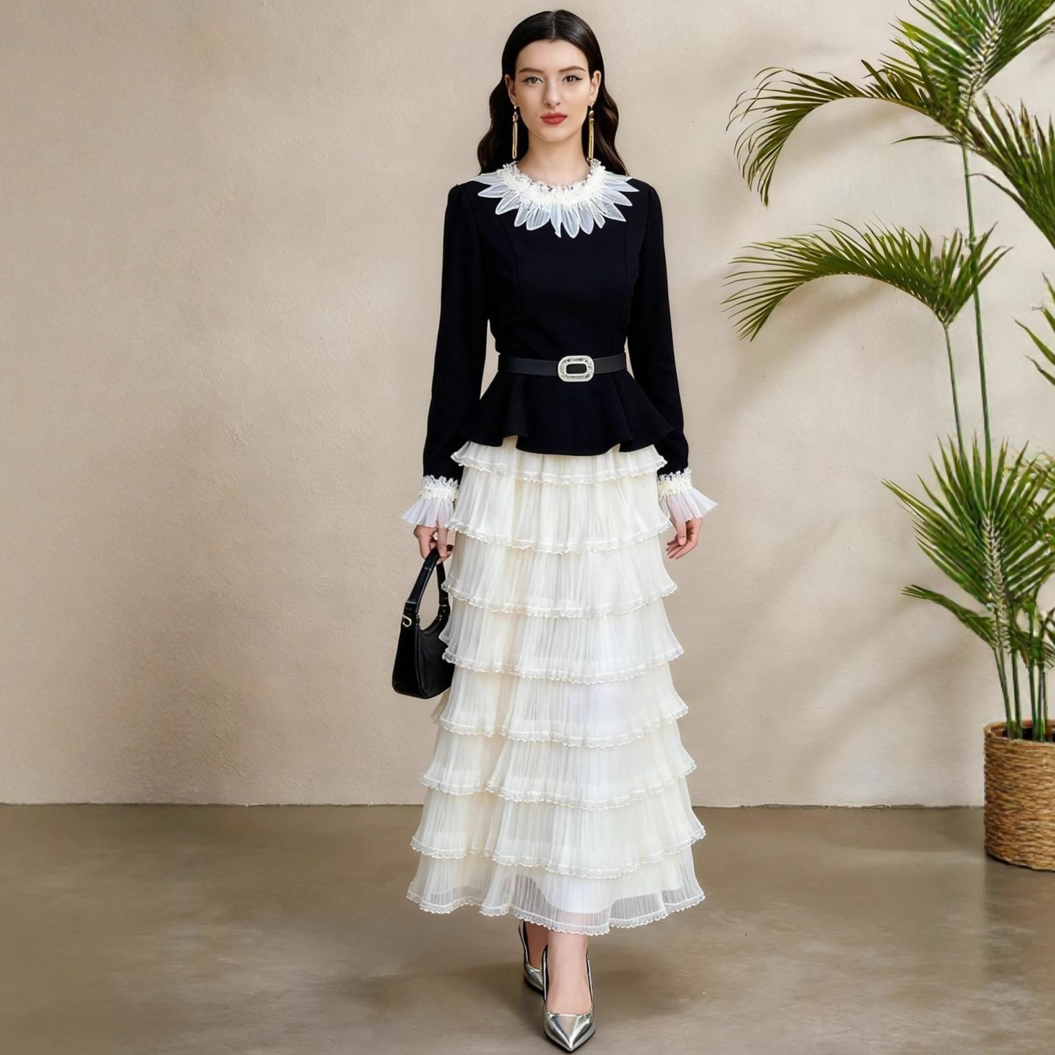 秋冬新款荷叶花边圆领上衣气质半身裙时尚套装高腰蛋糕裙两件套女
