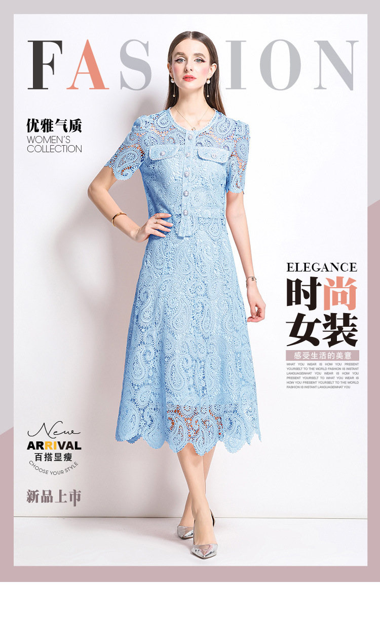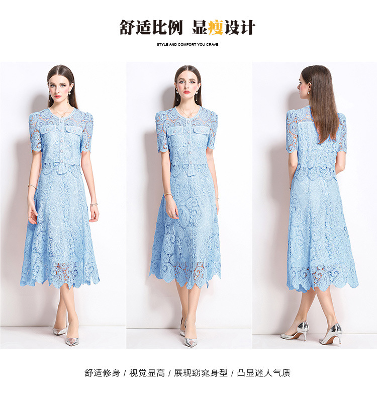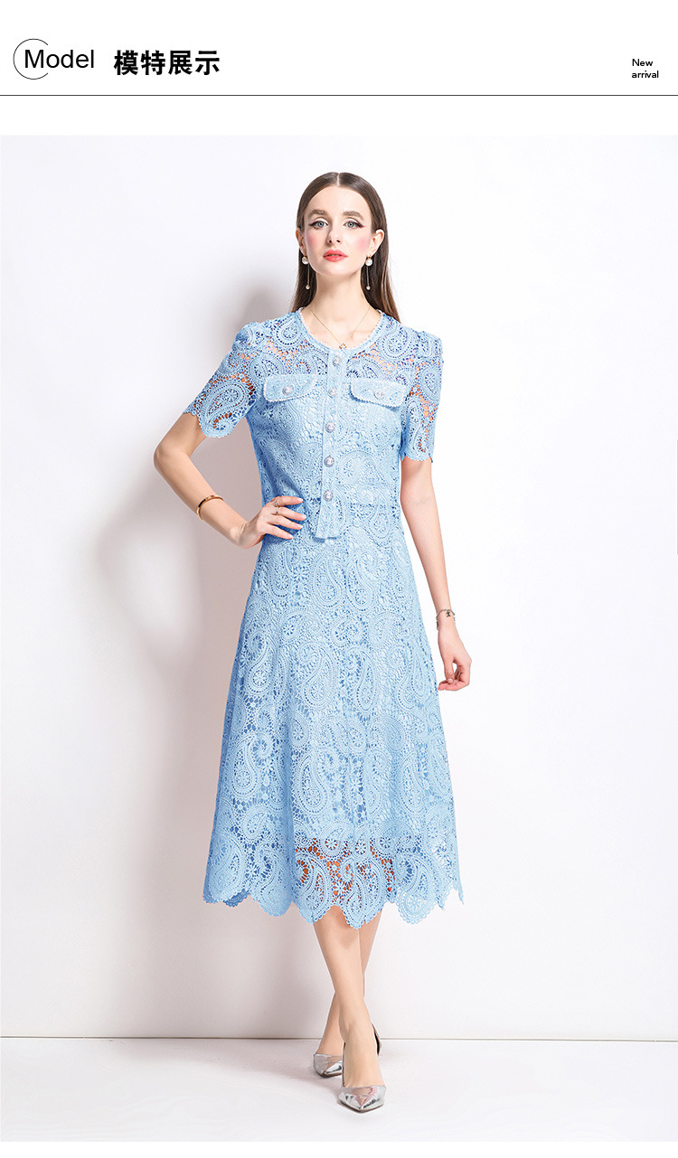 欧美跨境夏季新款时髦洋气重工镶钻圆领蕾丝刺绣中长款连衣裙女