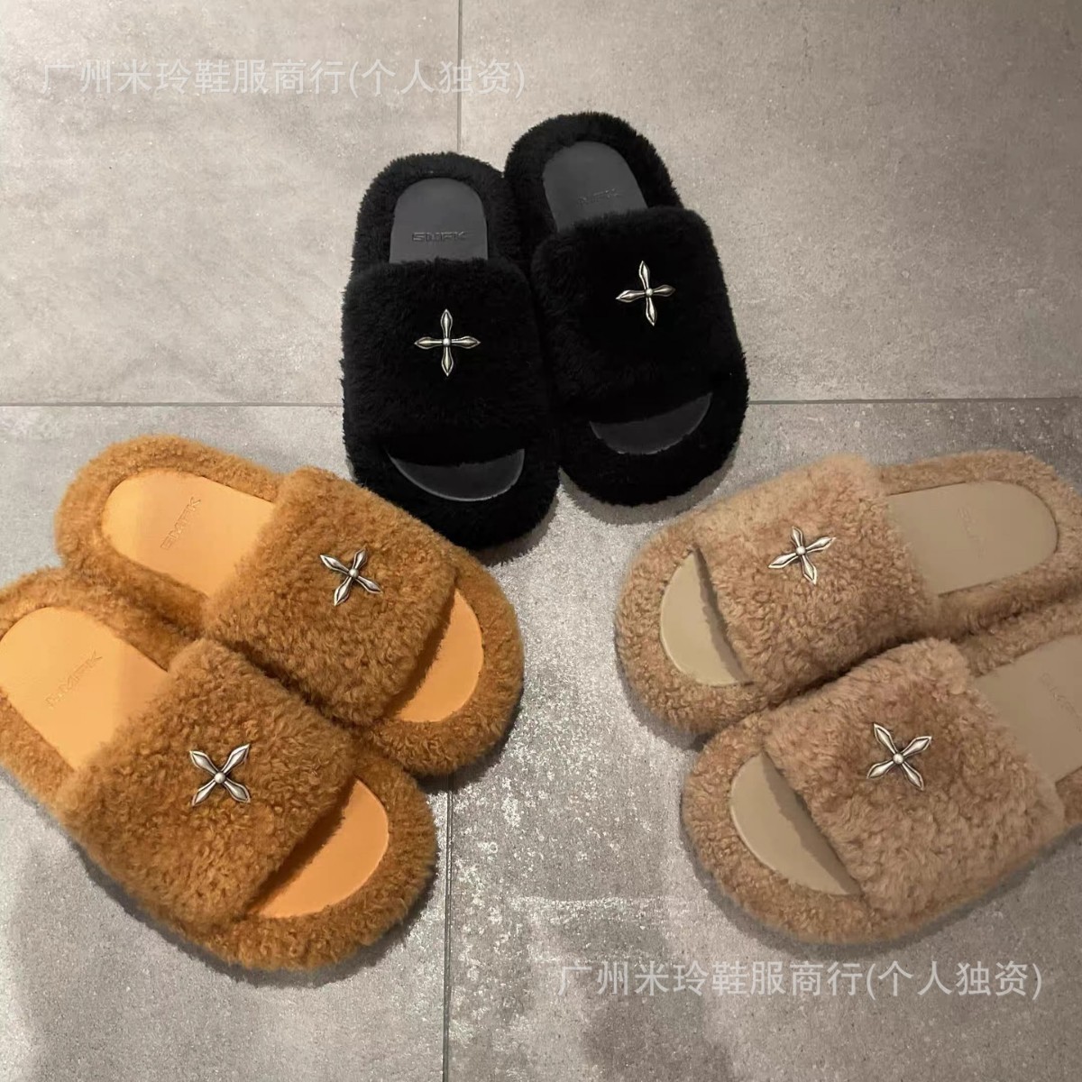 羊毛版~新款SM十字花厚底短毛拖鞋羊毛皮银扣厚底外穿短毛一字拖