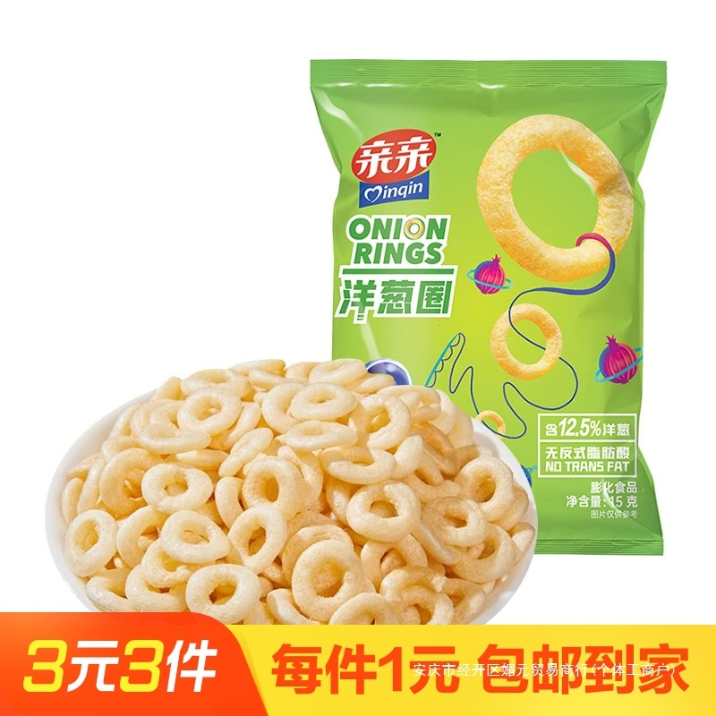 玉ねぎの輪15g海老のポテトチップスの膨化食品にキスする
