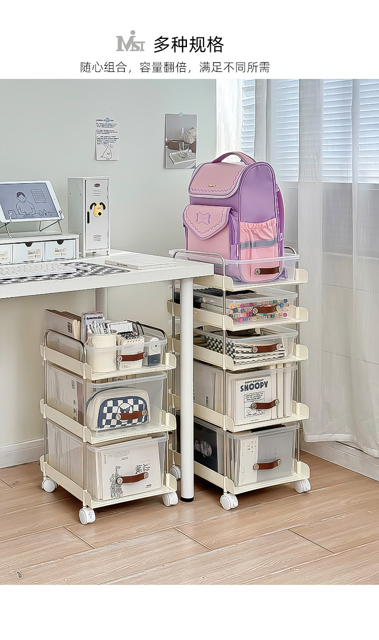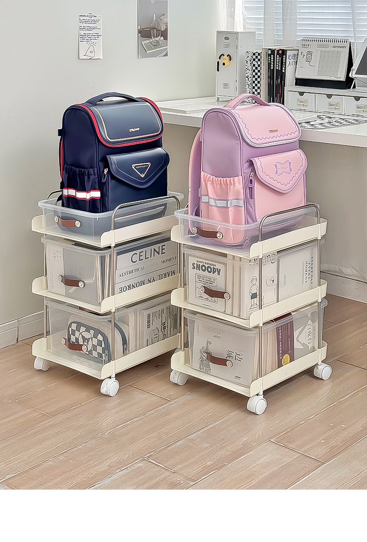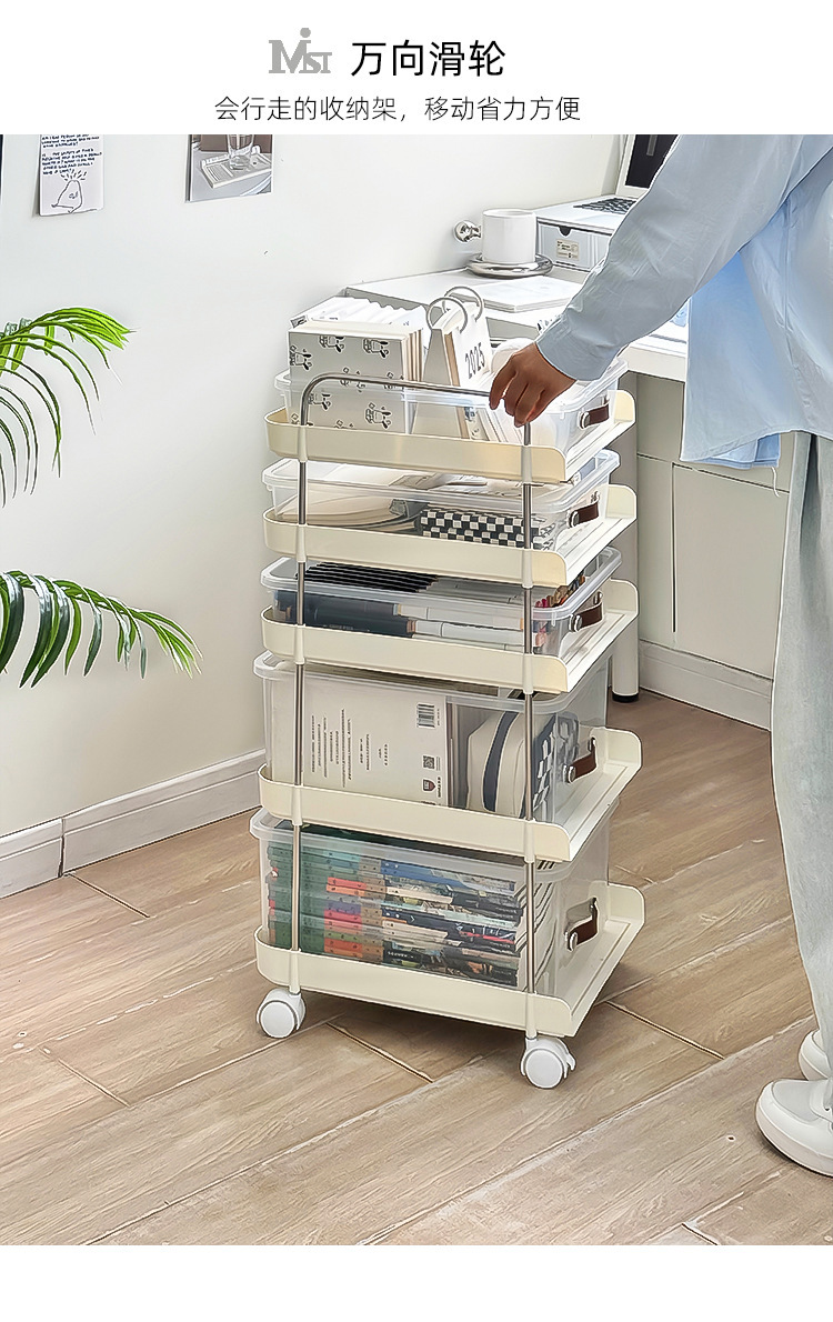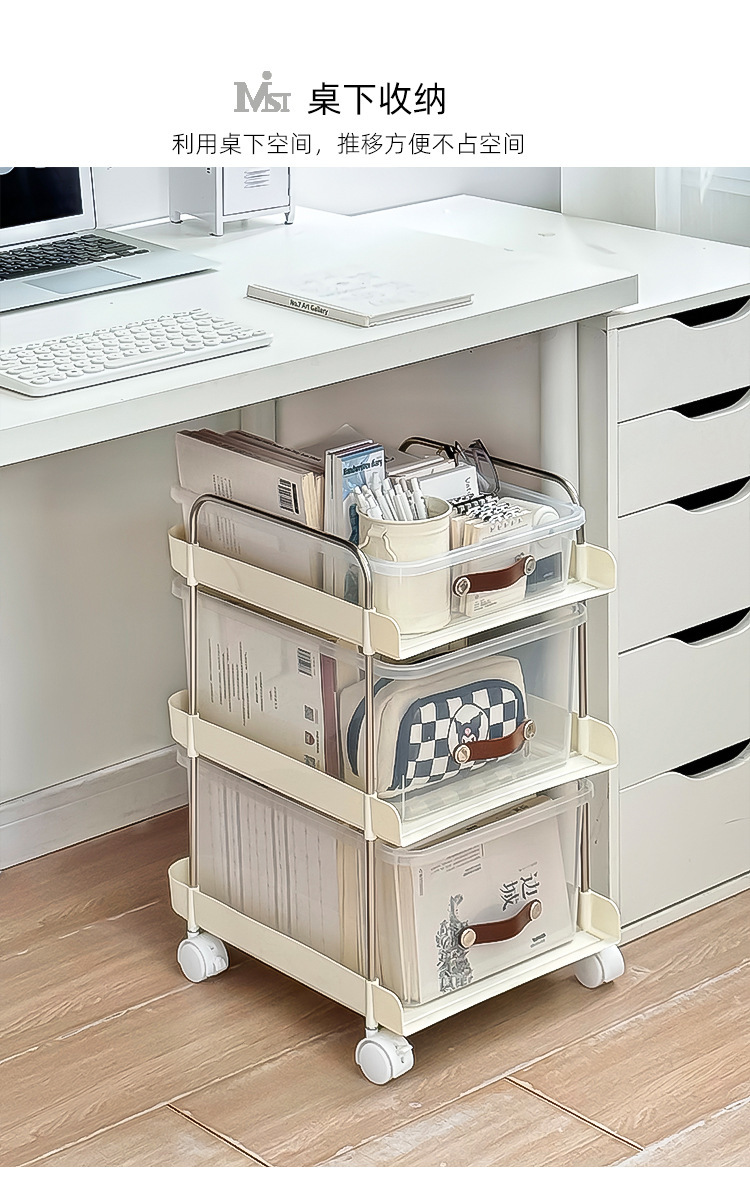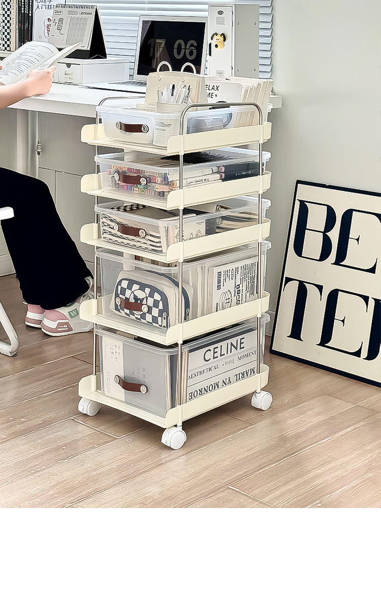 机の下に移動可能なカート棚が床に落ちた多層本棚オフィスのテーブルのそばにあるスナックバッグ収納神器