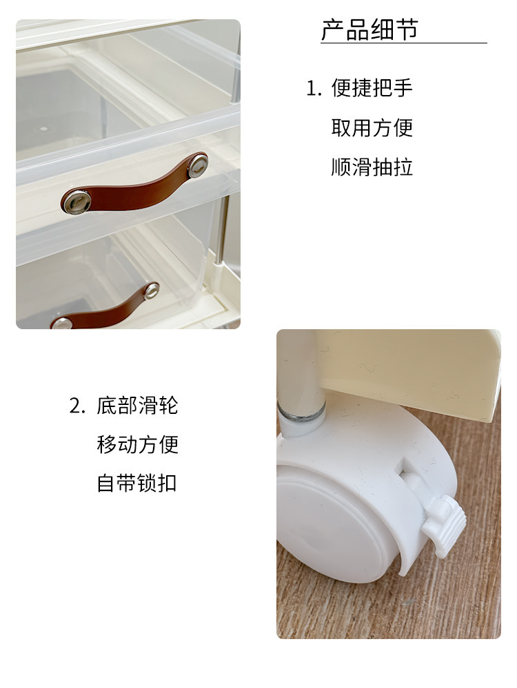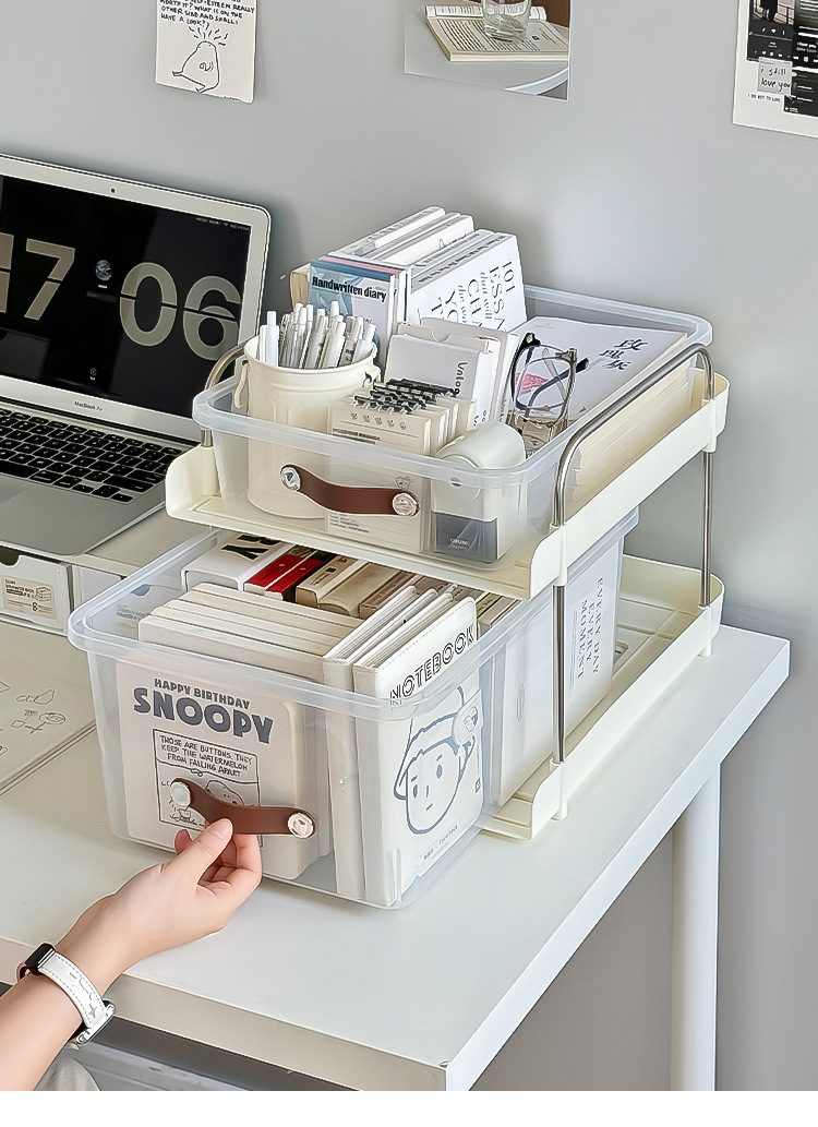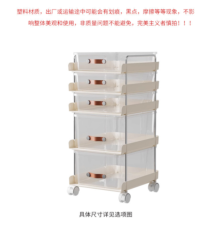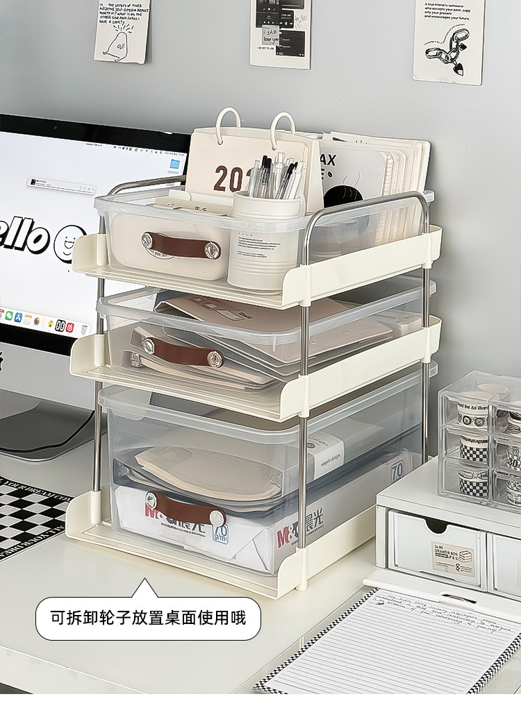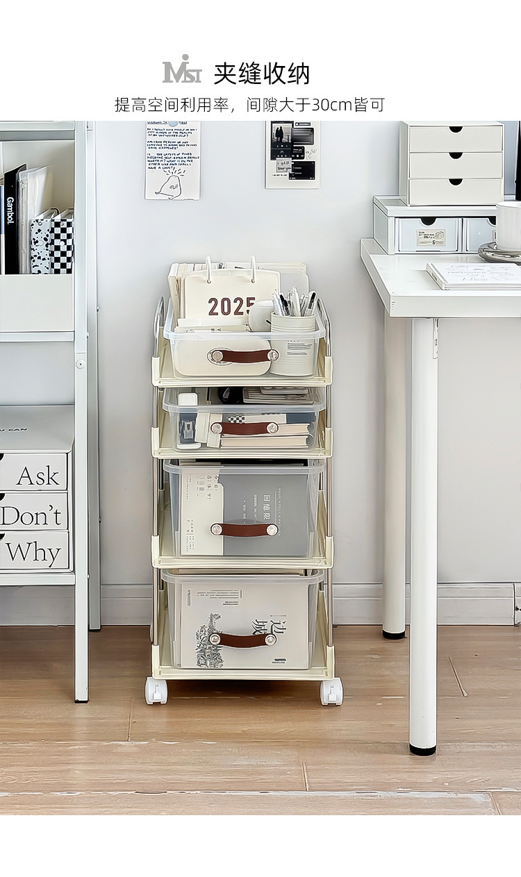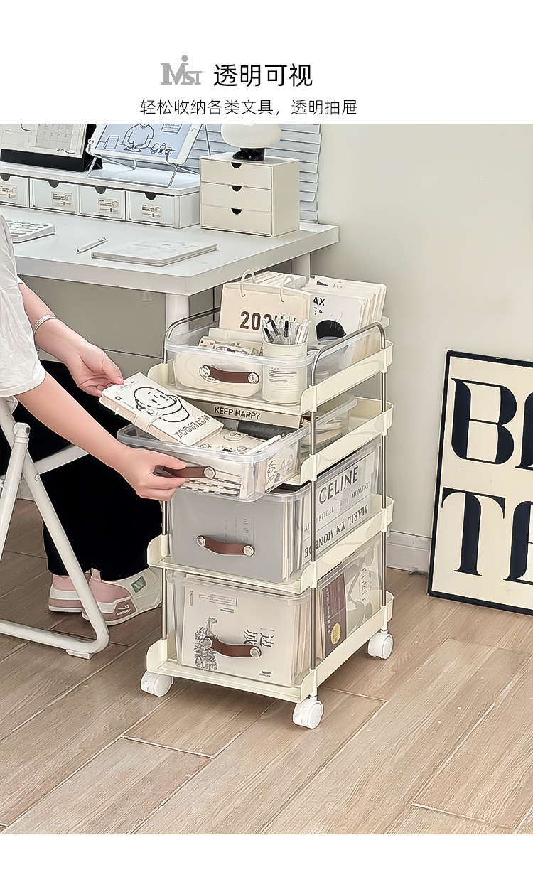 机の下に移動可能なカート棚が床に落ちた多層本棚オフィスのテーブルのそばにあるスナックバッグ収納神器