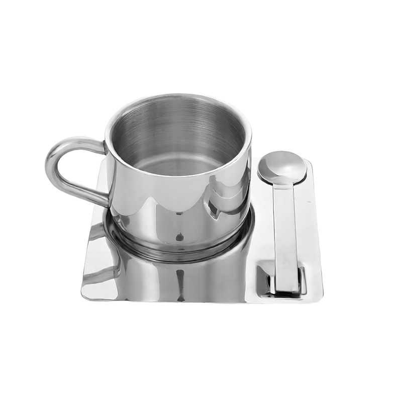 コーヒーカップセット 3点セット 304ステンレスカップ 二層カップ 業務用 家庭用 ミルクティーカップ スプーンプレート付き