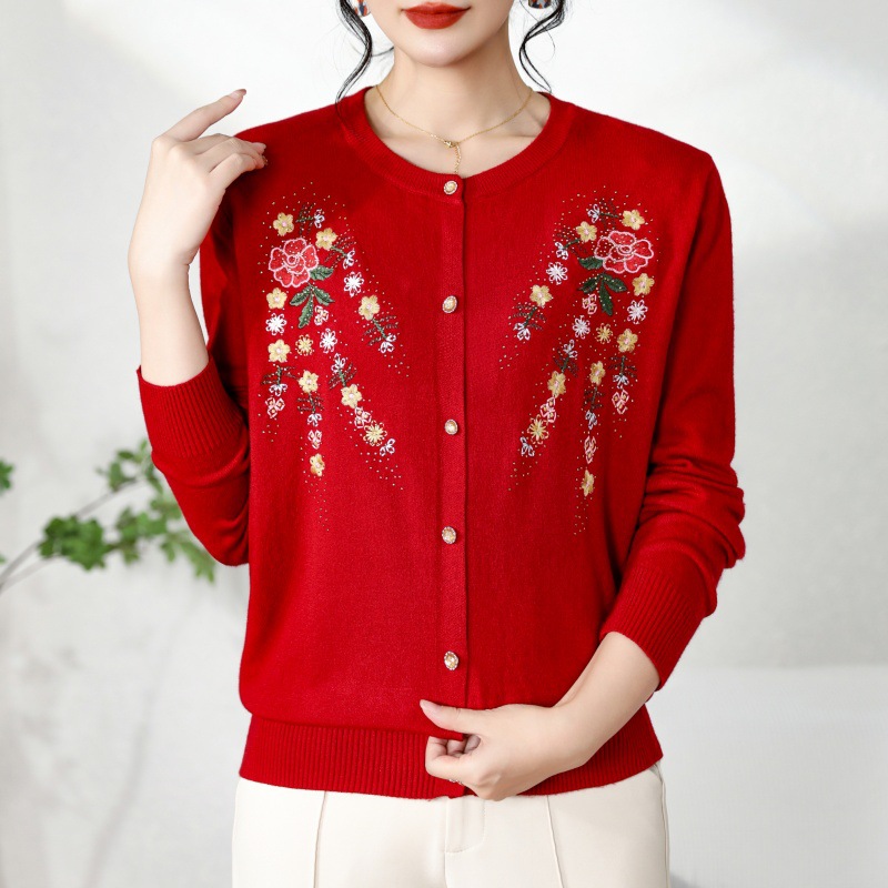 源工場製の刺繍入りカーディガン、高齢者向けのニットジャケット、中高年女性用ニットセーター、春秋用ママセーター