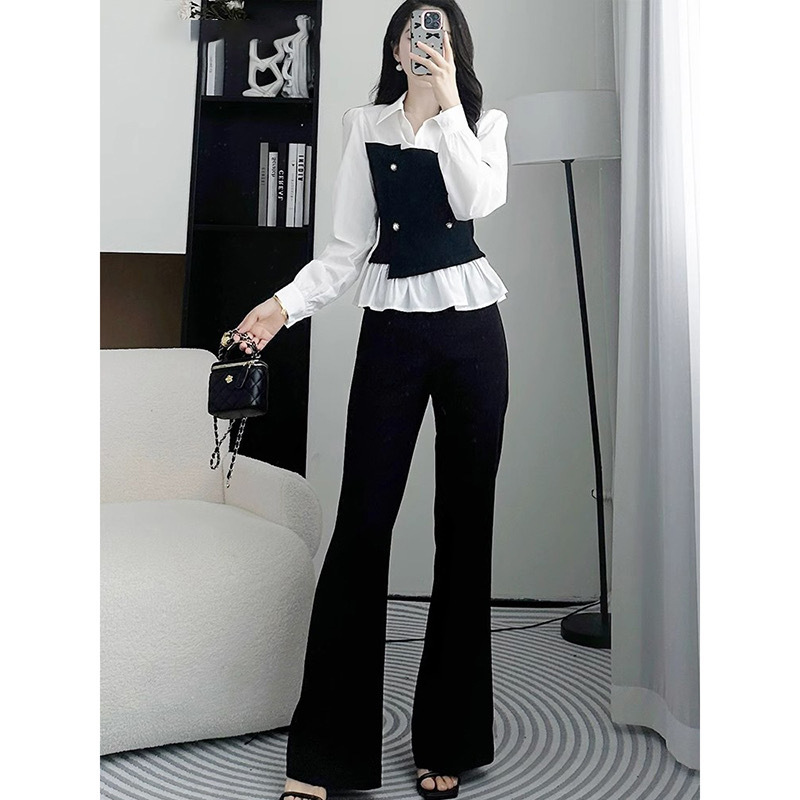 ファッションスーツの女性2025春の新型韓国版修身は偽のシャツの黒いトランペットのズボンの2つのセットをつなぎ合わせます。