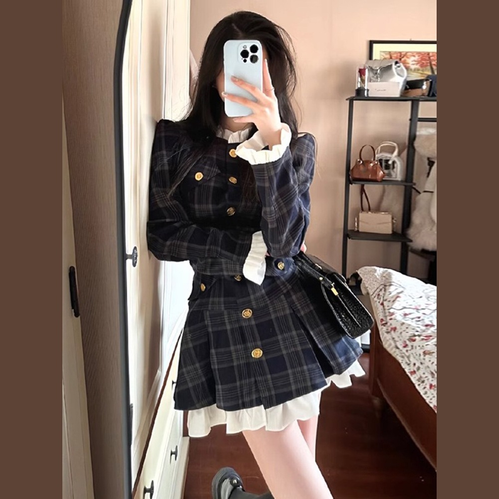 秋 2025 新しいスタイルの女性の裕福な娘ウエスト痩身カレッジフレンチサスペンダー偽ツーピースドレス女性のための