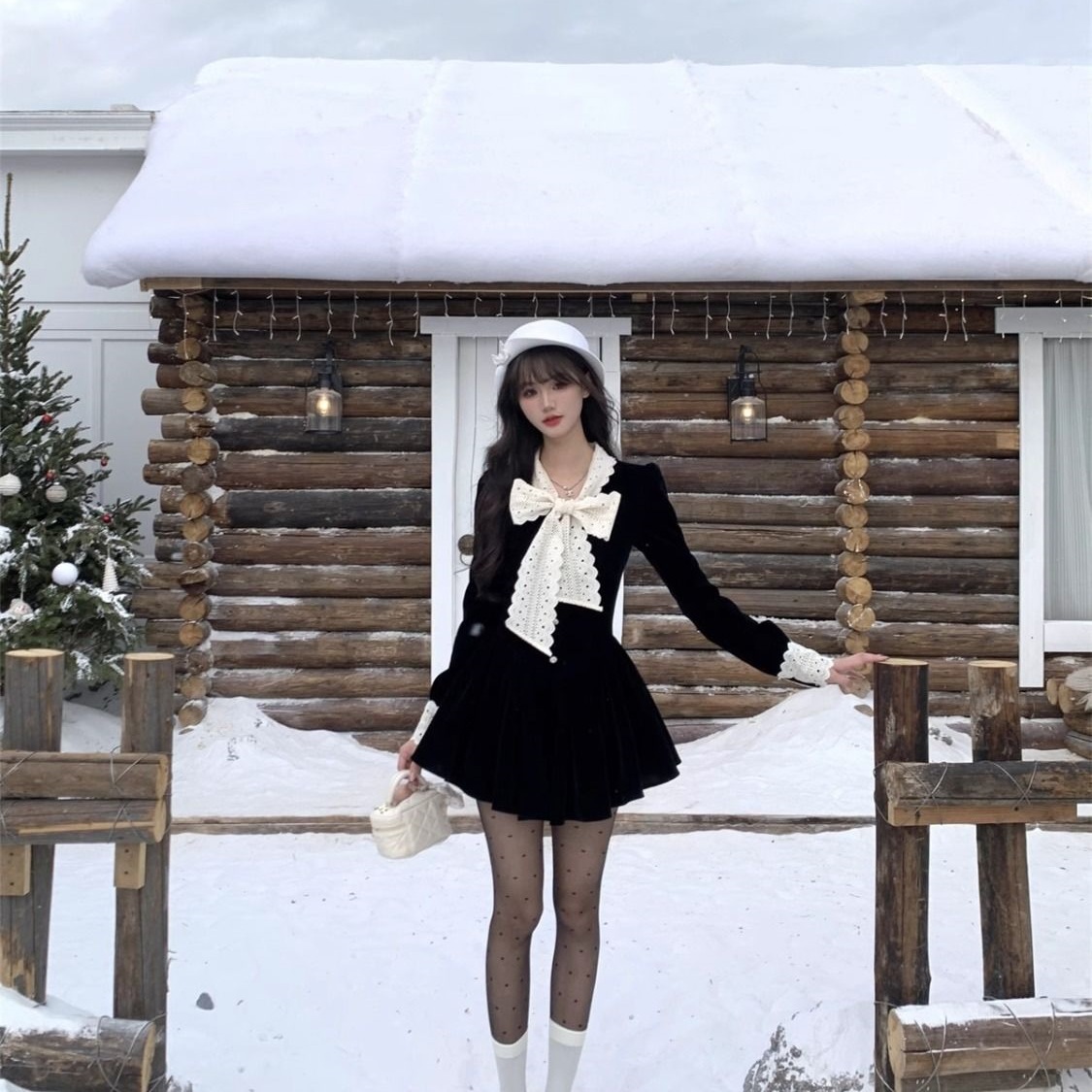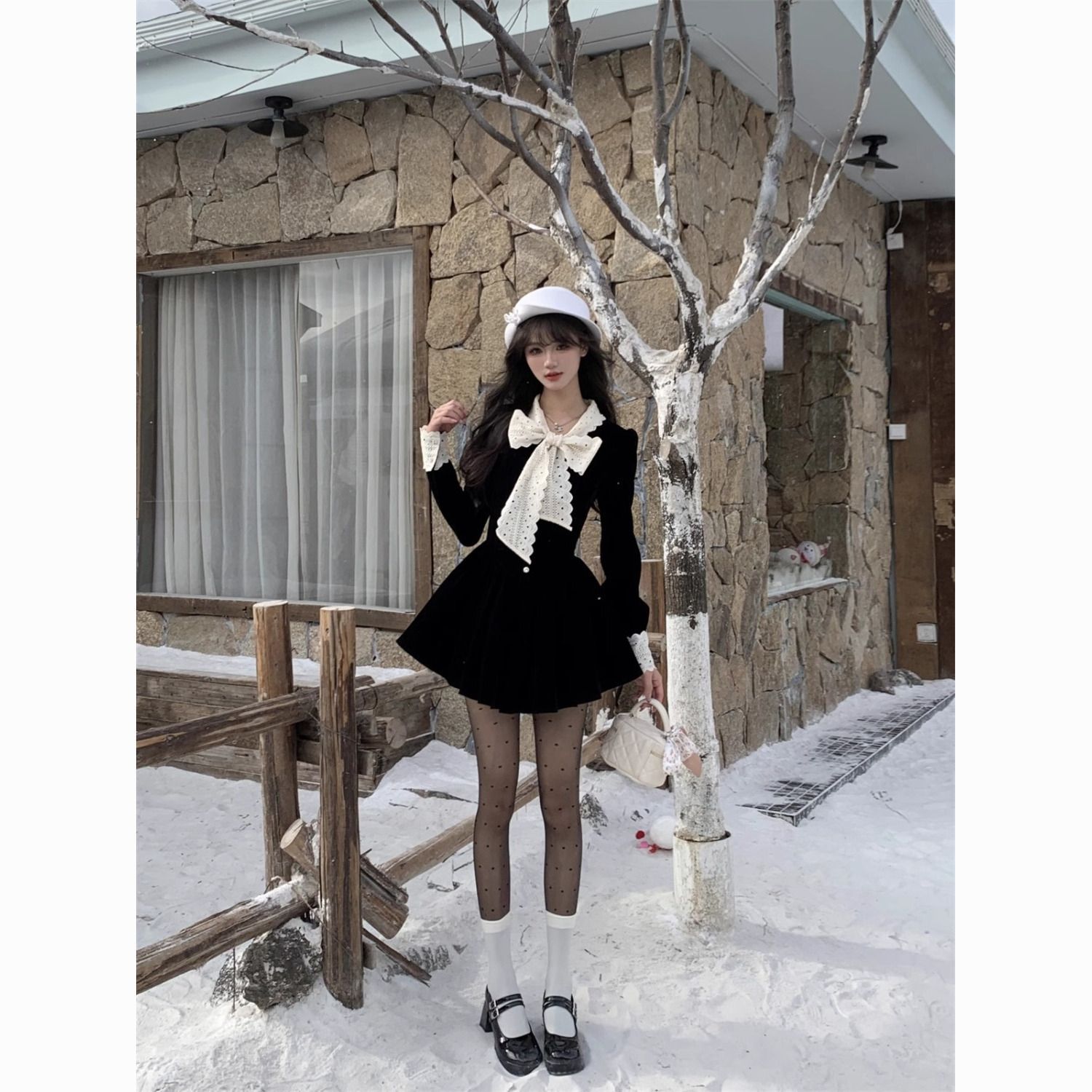 富家千金小香风连衣裙女秋冬设计感小众蝴蝶结公主裙法式收腰裙子