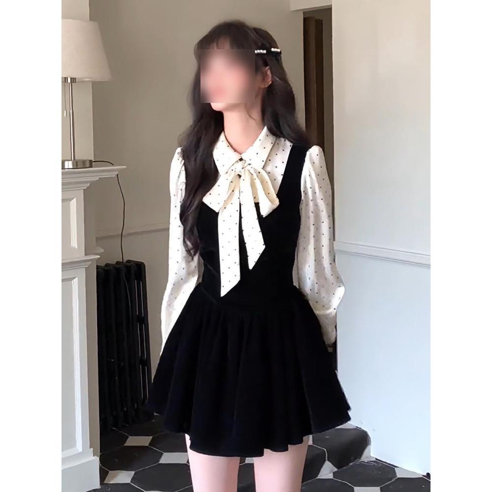 ミウ系の高級感漂うリトル・フレンチスタイルのワンピース、水玉模様のフェイクツーピース、ウエストシェイプの黒ワンピース