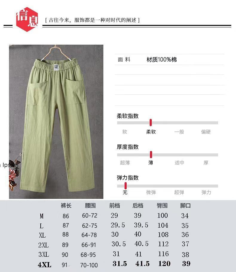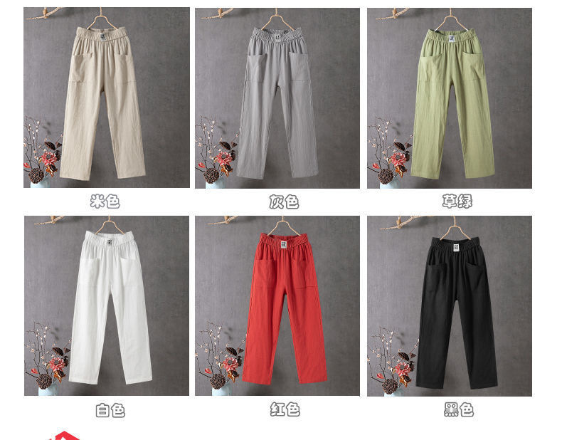 女性用夏用薄手綿麻カジュアルパンツ、スリムで万能、ハイウエスト、大きいサイズ、ゆったり、中高年女性用9点ワイドパンツ