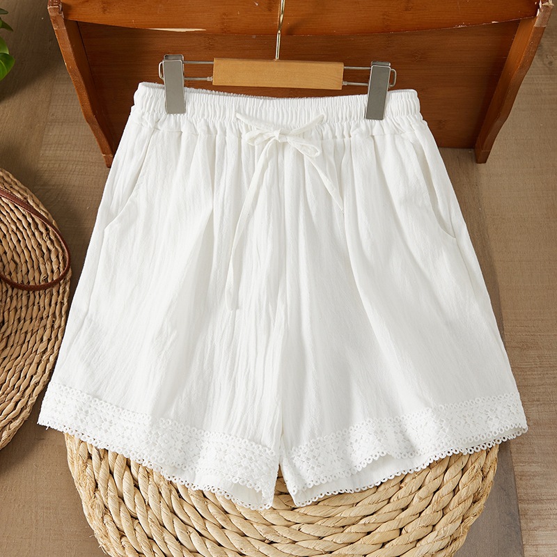 2025 夏新レトロ中空かぎ針編み綿とリネンのパンツ女性の文学レースショーツカジュアルパンツ痩身ストレートパンツ夏