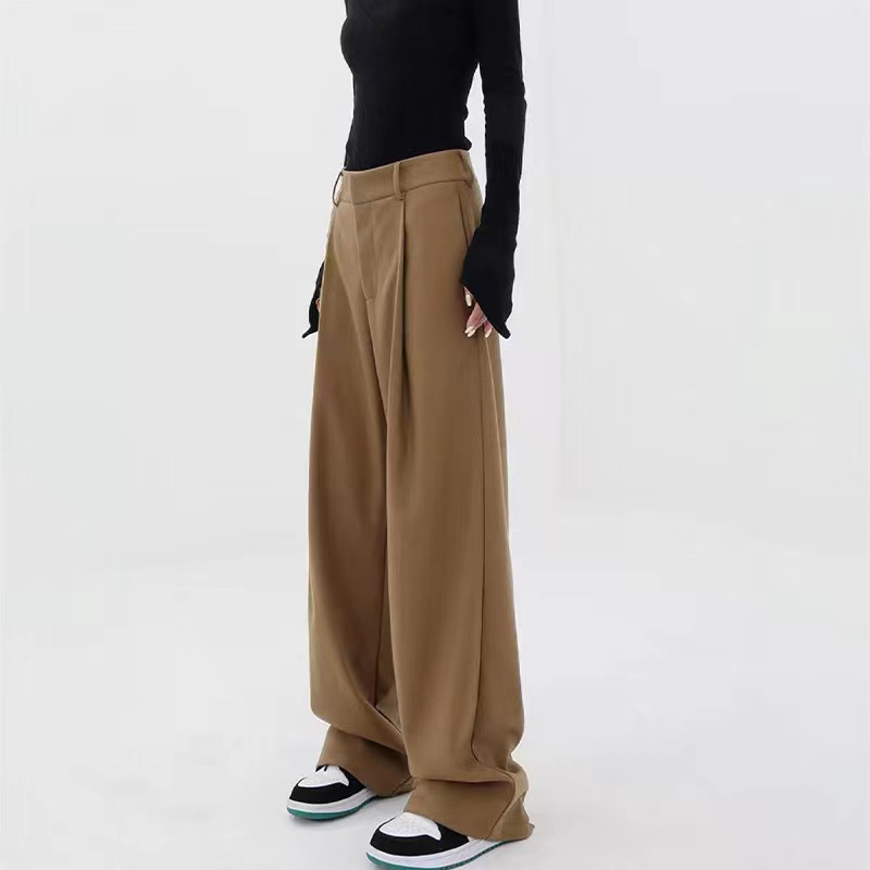 女性用ブラウンワイドレッグスーツパンツ2025春秋新作ハイウエスト超ワイドデザインストレートレッグルーズドレープカジュアルパンツ
