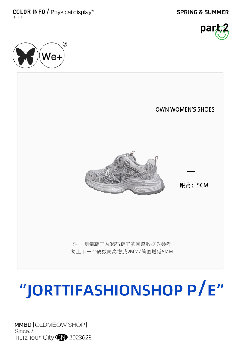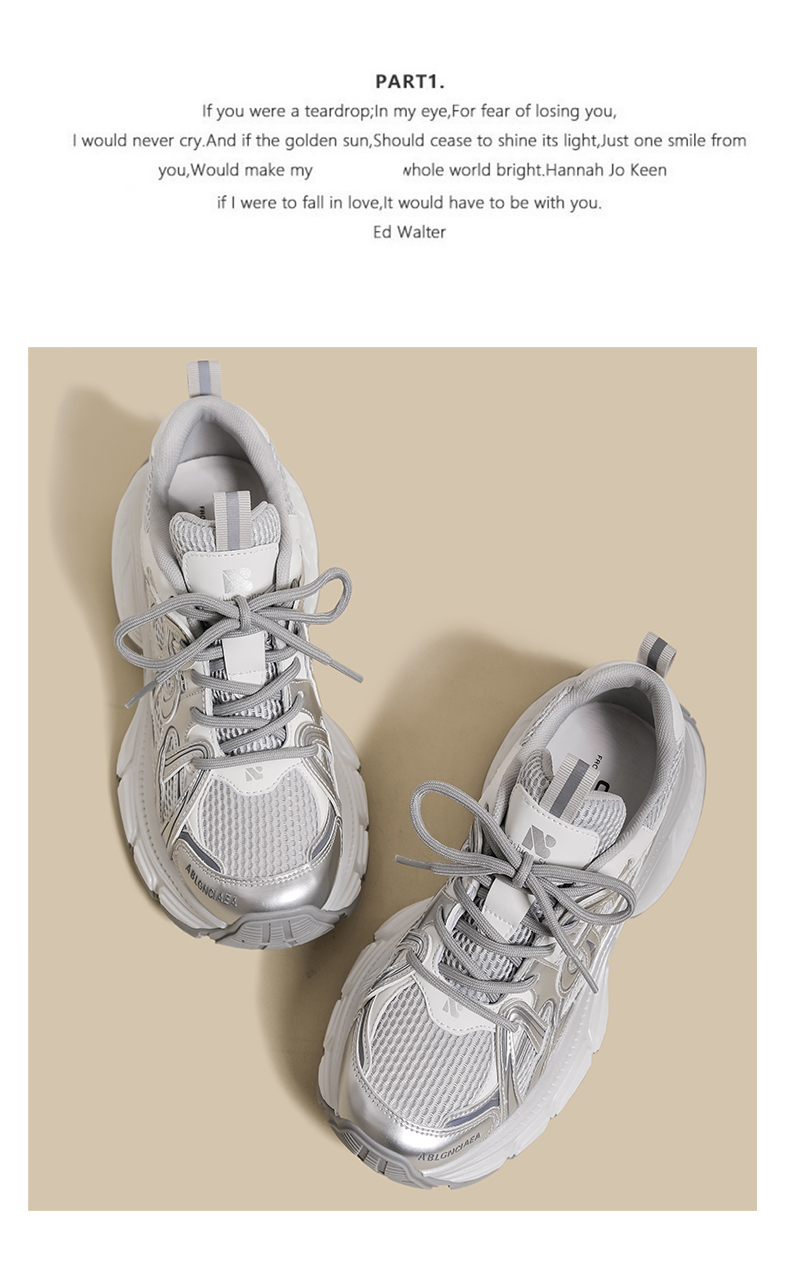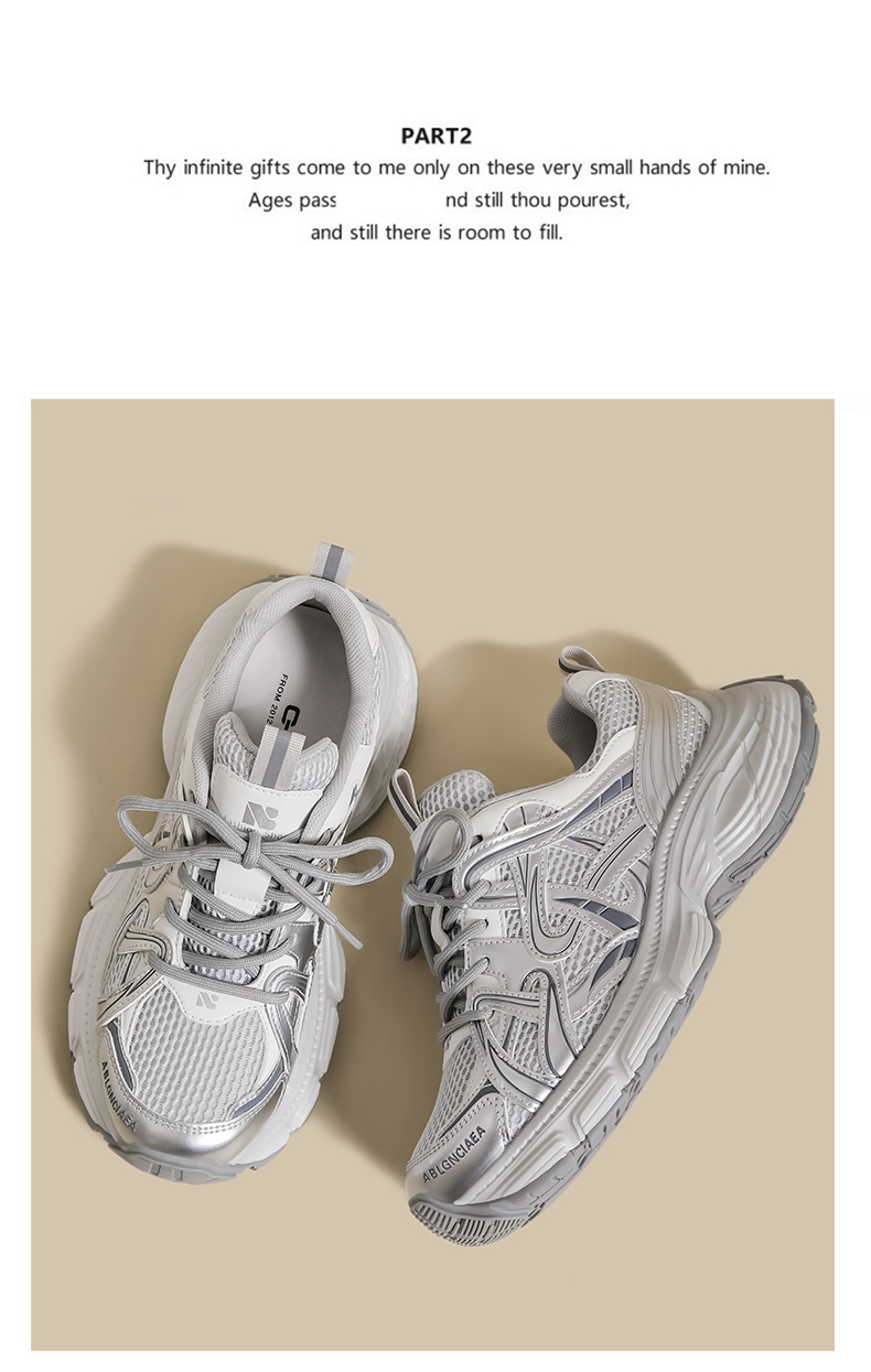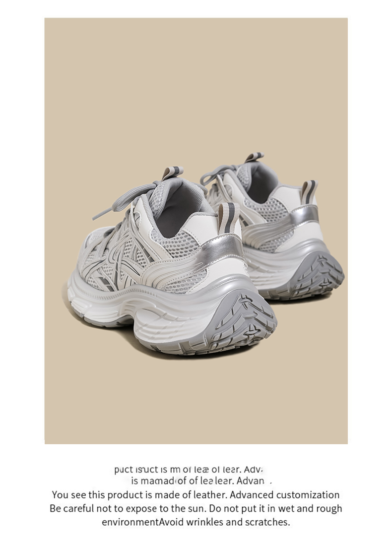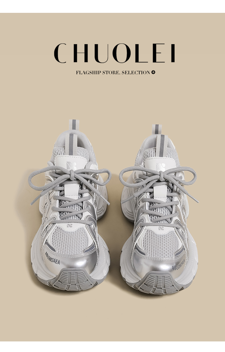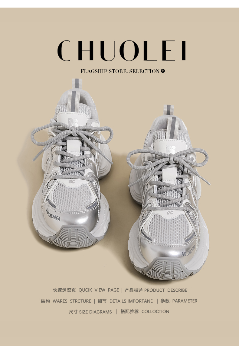 本革のレトロな銀色のお父さんの靴の女性の2025春の新型の厚い底のネットの運動靴はカジュアルな靴を合わせます。