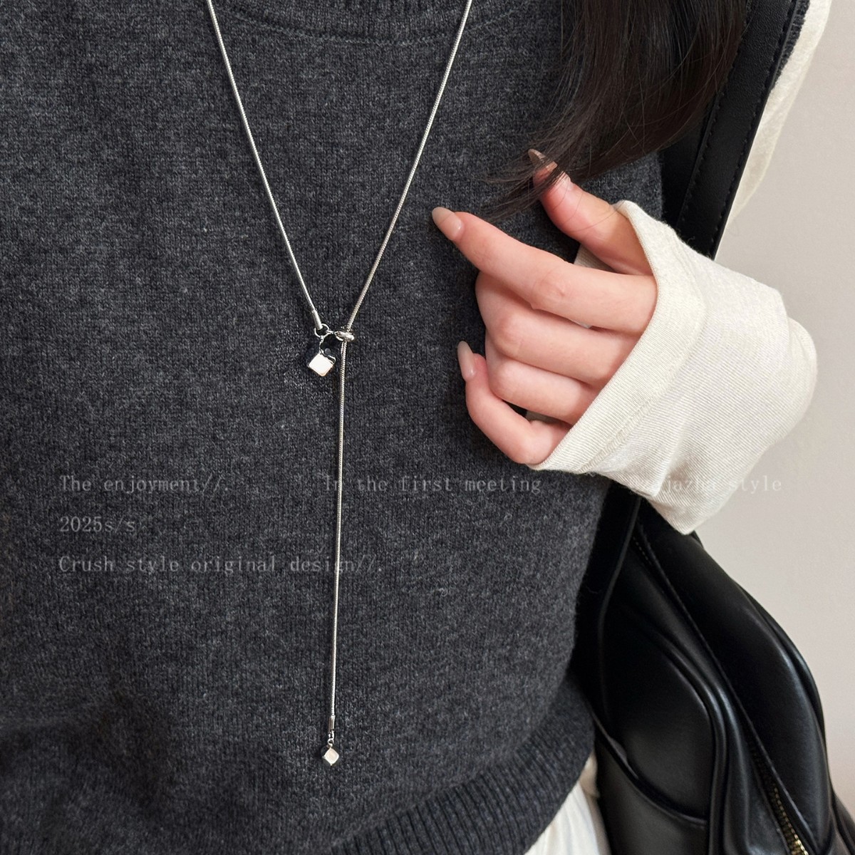简约金属方块吊坠项链女高级感轻奢小众毛衣链长款抽拉可调节配饰