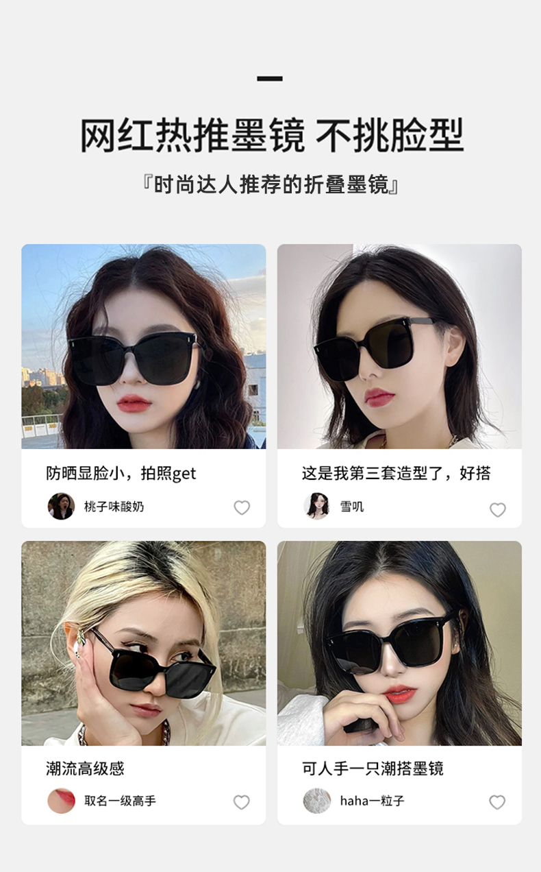 新しいスタイルのポータブルで保管しやすい女性用紫外線防止サングラス、ハイエンド、顔が見える、同じスタイルの折りたたみサングラス、小さなインターネットセレブ