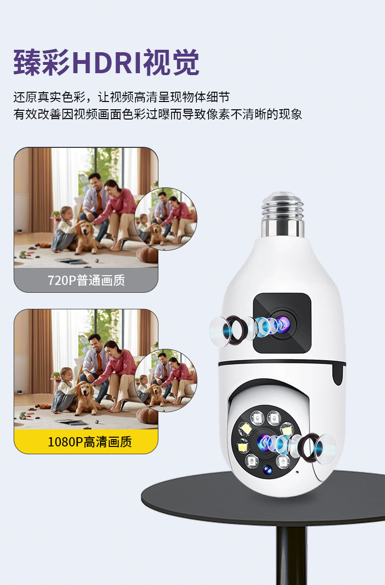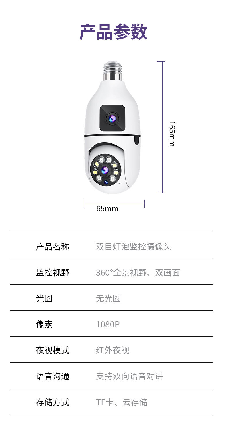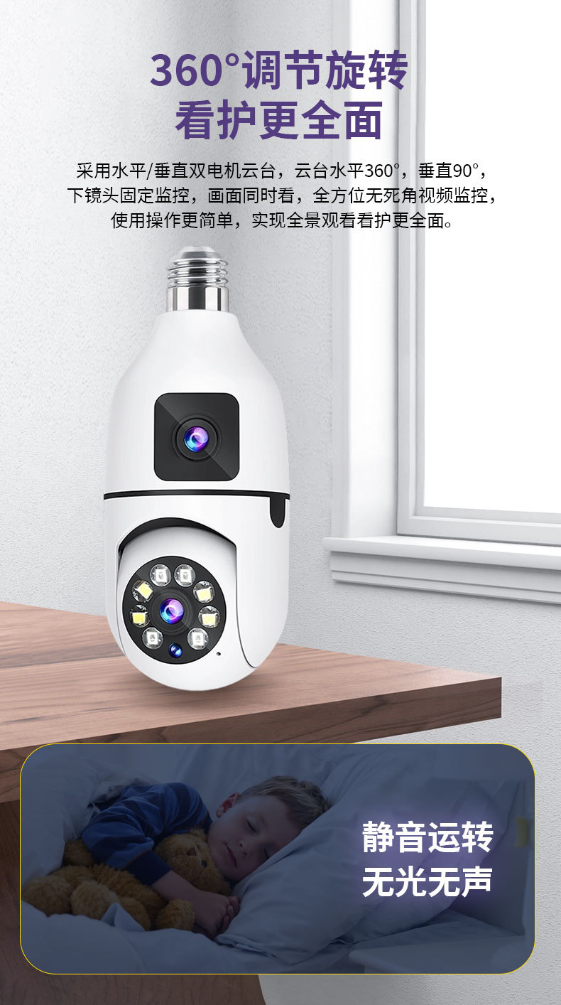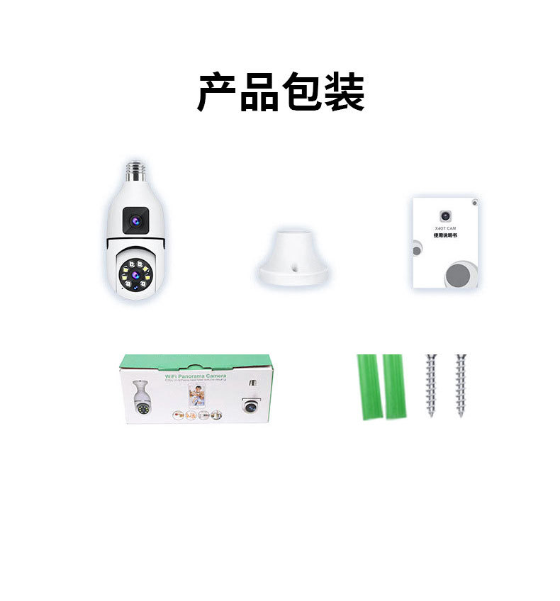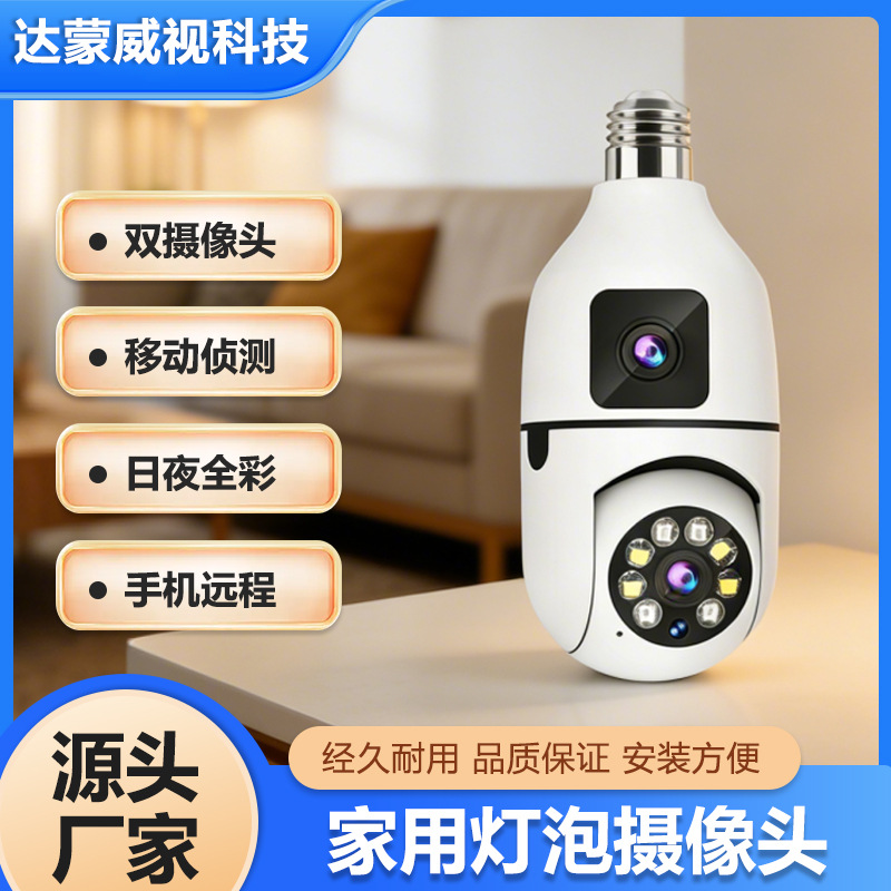 3MP跨境爆款双目灯泡摄像头无线双画面全彩高清夜视360室内双光监